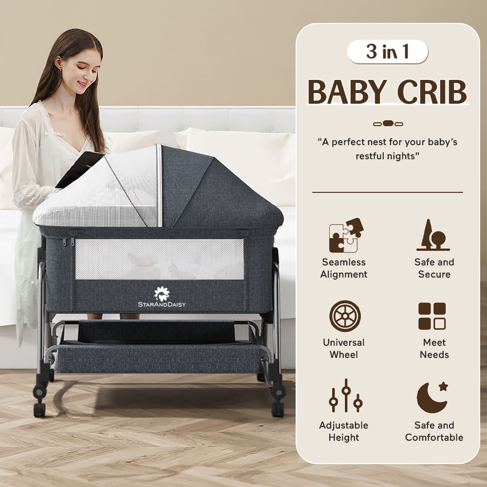 StarAndDaisy Multifunctional Baby Crib with Mosquito Net, Bed Side Baby Crib with 7 Levels of Height Adjustment & Spacious Storage Basket – Golden