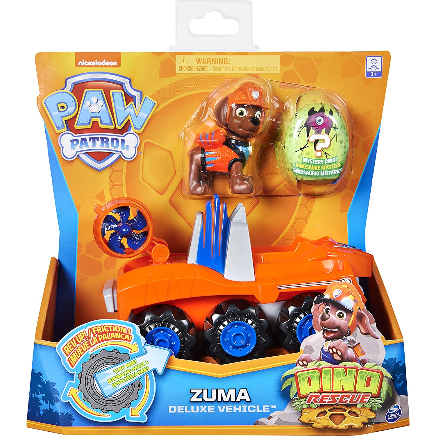 Go on Exciting Dino Rescues with Zuma and his Dino Rescue Deluxe Vehicle from Paw Patrol. This one-of-a-kind vehicle includes Zuma and a mystery dino miniature. Zuma’s Rugged Vehicle Is Ready For Action, Featuring Dinosaur-Inspired Details, A Working Tool, A Rev Up Motor, And Large Wheels To Rule Any Surface.