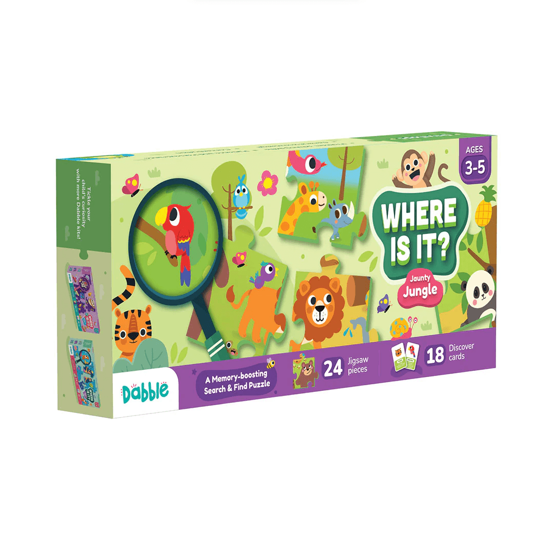 Introducing Playshifu Dabble Where Is It? Jaunty Jungle – the ultimate puzzle adventure for kids aged 3-5! Unleash your child’s creativity and problem-solving skills as they assemble the jumbo-sized jigsaw pieces to complete a magnificent jungle scenery. But the excitement doesn’t stop there! Within this captivating puzzle, little explorers can embark on a thrilling Search & Find mission using the included 18 Discover cards to locate animals, fruits, plants, and more. This collaborative game fosters family bonding while enhancing vocabulary and general knowledge about the jungle world. Dabble Where Is It? Jaunty Jungle is more than just a puzzle; it’s a fun and educational experience that builds concentration, problem-solving abilities, patience, and perseverance. In the box, you’ll find 24 jigsaw pieces and 18 Discover cards, making it the perfect adventure for young adventurers.