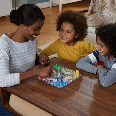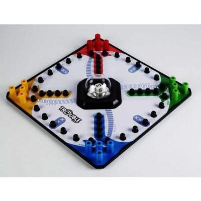 Pop into the racing, chasing game where everyone’s in Trouble! Set up your pegs and then hit the Pop-O-Matic die roller. Depending on what you roll, you can move your pegs to the Start space, move your pegs forward, or watch other players move while you can’t! Each of your pegs has to go all the way around the board to the Finish space but watch out if another player’s peg lands on the same space as yours, your peg has to start over. The player who gets all 4 pegs into the Finish space wins! Pop all around the board for the win when you play Trouble!