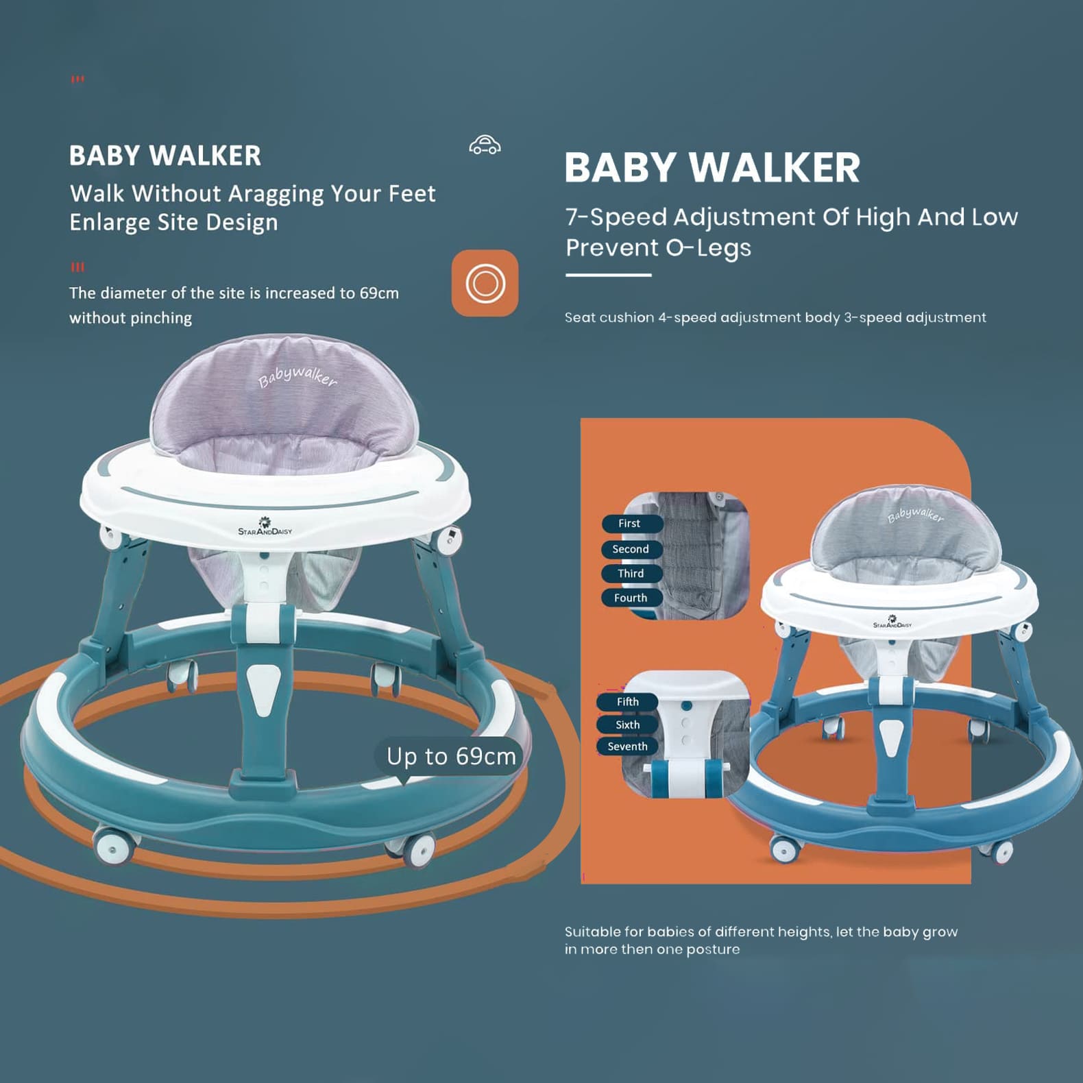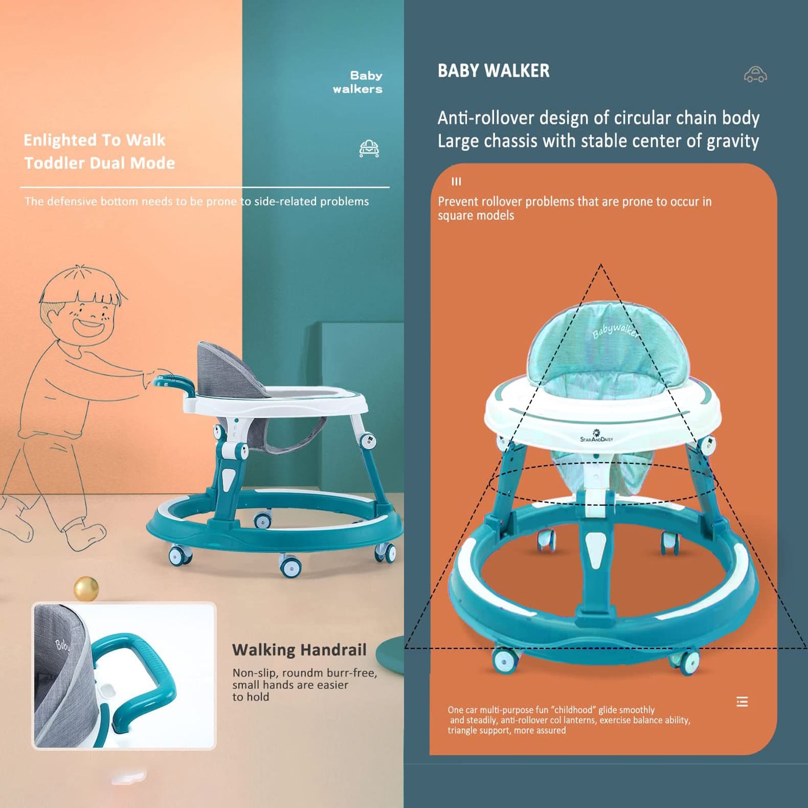 [Refurbished] StarAndDaisy 360° Baby Walker Adjustable Height, Multi-Function Anti-Rollover Folding Walker with Height Adjustable 6-18 Months Male and Female Baby Walker (Blue)