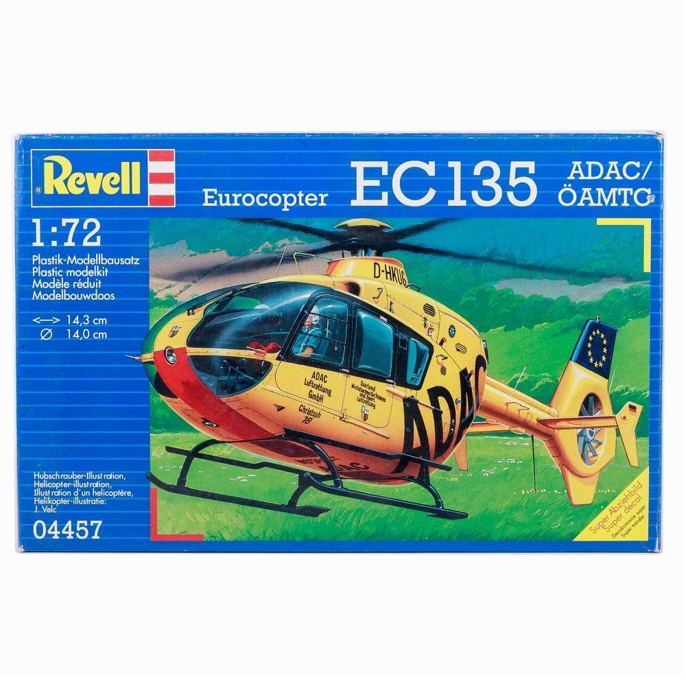 The Revell Eurocopter EC135 Helicopter ADAC/OAMTC is a plastic model kit that offers a true-to-scale 1:72 replica. It features structurally detailed surfaces with flush metal joints, a fully fitted emergency cabin, stabilized skid landing gear, and a detailed cockpit. The kit includes movable main rotor and detailed decals for both the ADAC and the OAMTC versions.