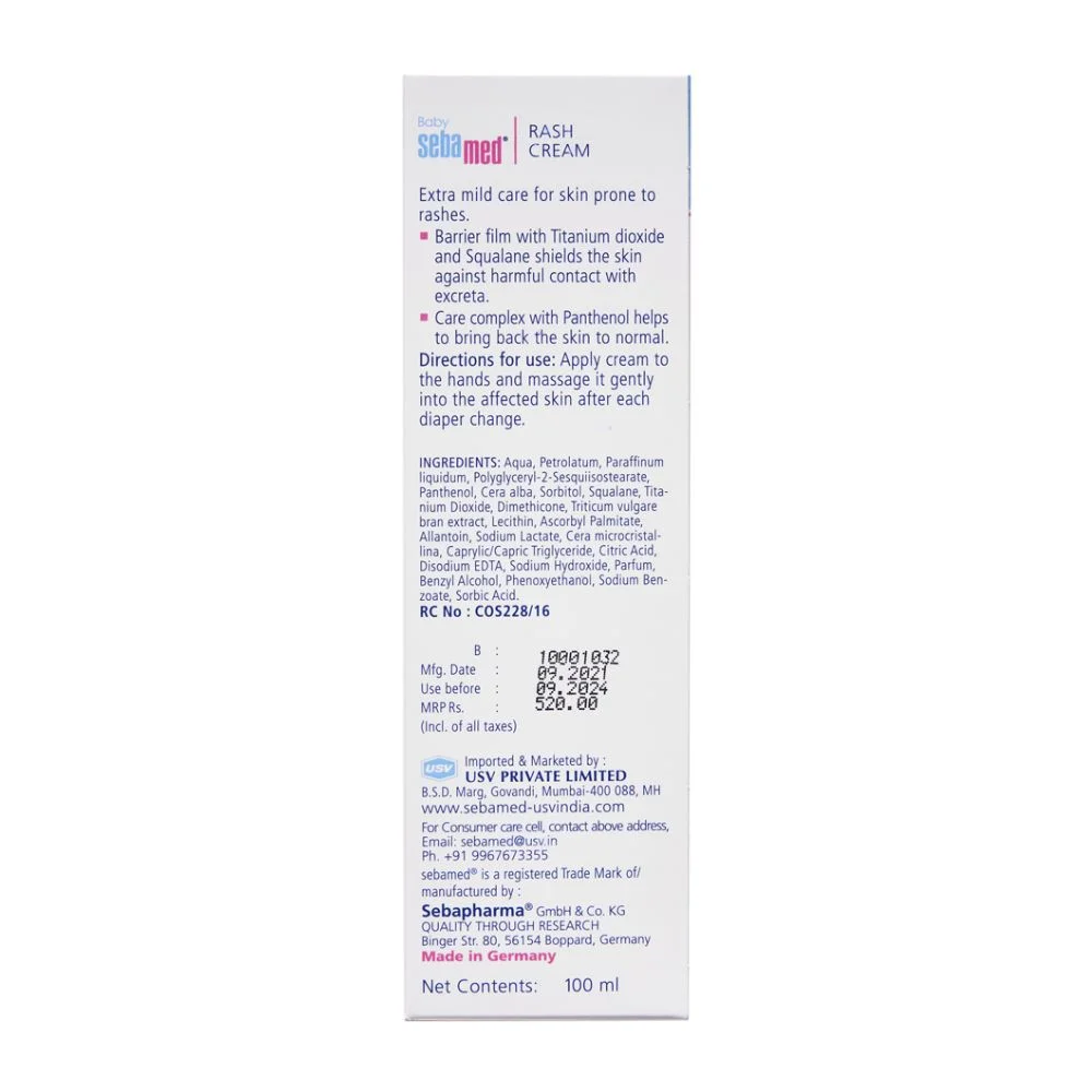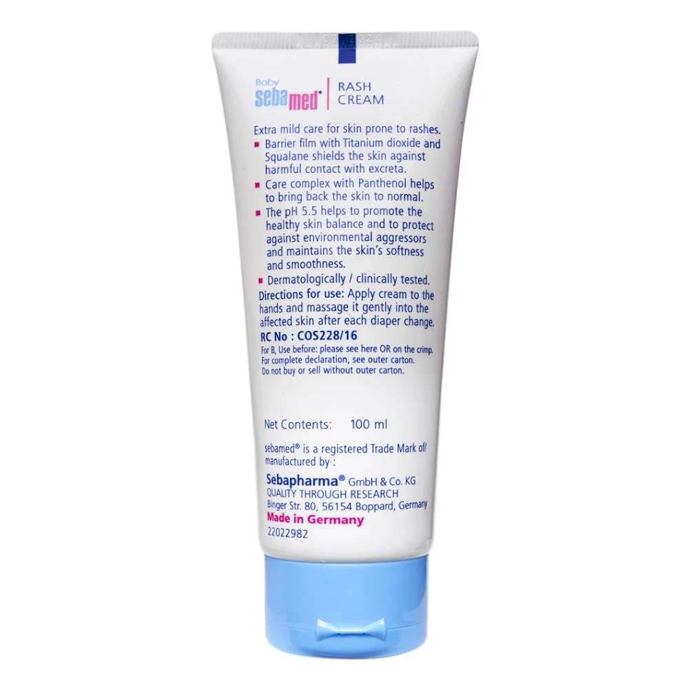 Sebamed Baby Rash Cream is formulated with micronized titanium dioxide that forms a protective physical barrier on baby’s skin to shield against irritation from wetness and diaper friction. Its pH 5.5 formulation supports the skin’s natural acid mantle, speeding recovery and helping prevent infection. Enriched with panthenol to promote healing, wheat bran extract to soothe rashes, and natural beeswax, squalene, and sorbitol to enhance hydration, the cream visibly reduces redness, dryness, and discomfort. Clinically proven to reduce diaper rash within 3 weeks, it is dermatologically tested and safe for use from 1 month onwards.