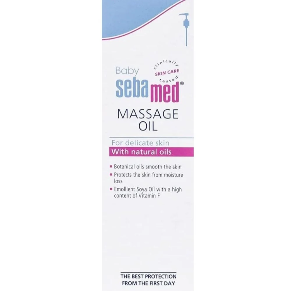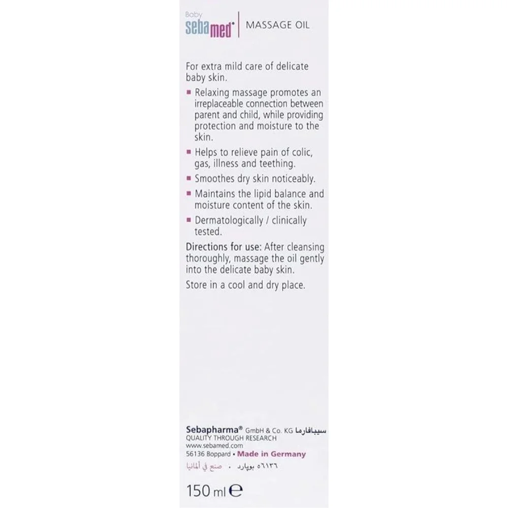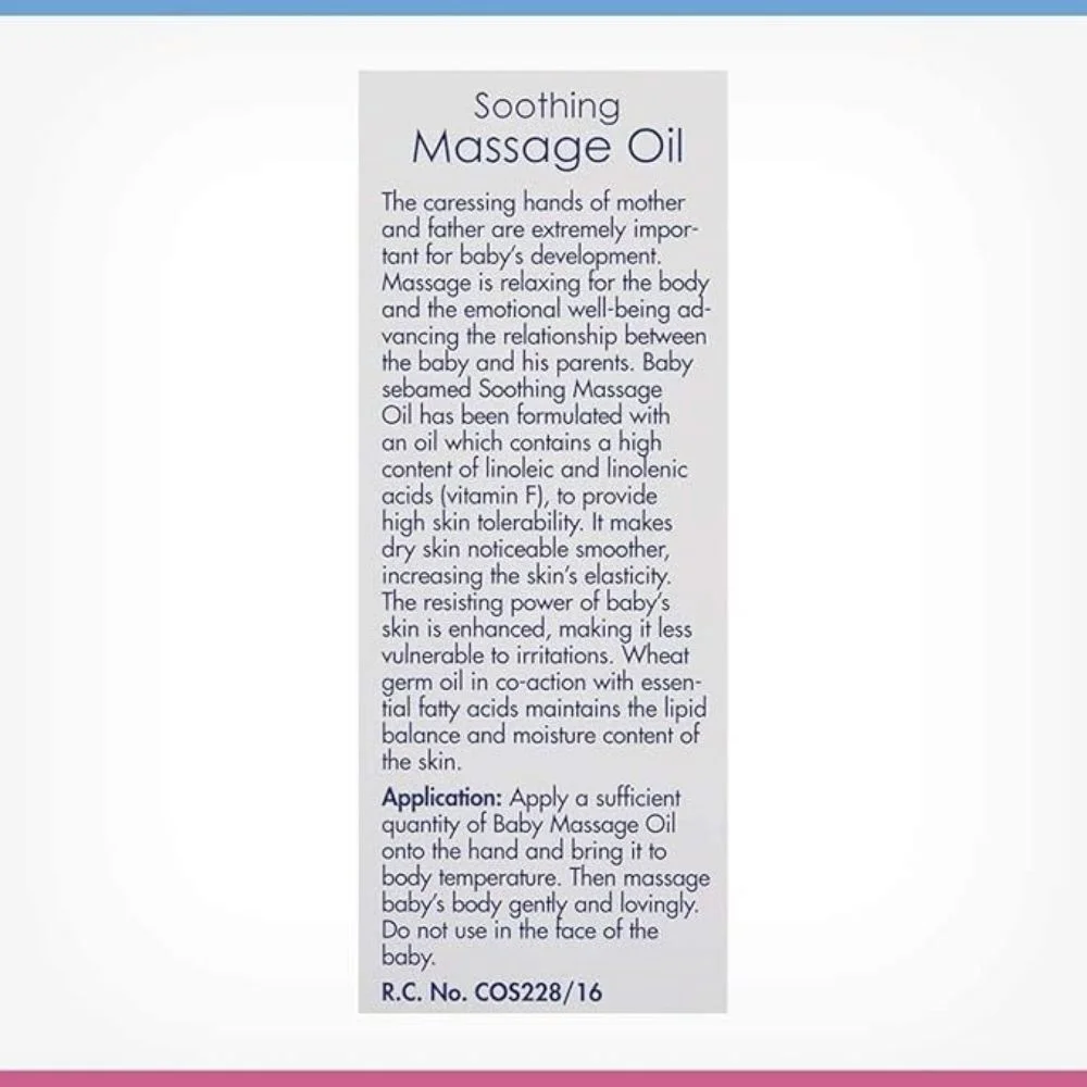 Sebamed Baby Soothing Massage Oil is a gentle, nourishing blend enriched with natural botanical oils and emollient soya oil to care for delicate baby skin. Formulated with Vitamin F and essential fatty acids, it supports skin elasticity, protects against moisture loss, and smoothens dry, sensitive skin. Dermatologically and clinically tested, this lightweight massage oil helps strengthen the skin barrier while providing comfort and hydration. Ideal for daily massage, it promotes bonding between parent and baby and may help soothe colic discomfort. Free from harmful mineral oils and colorants, it ensures safe year-round care.