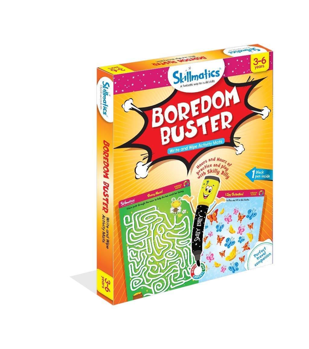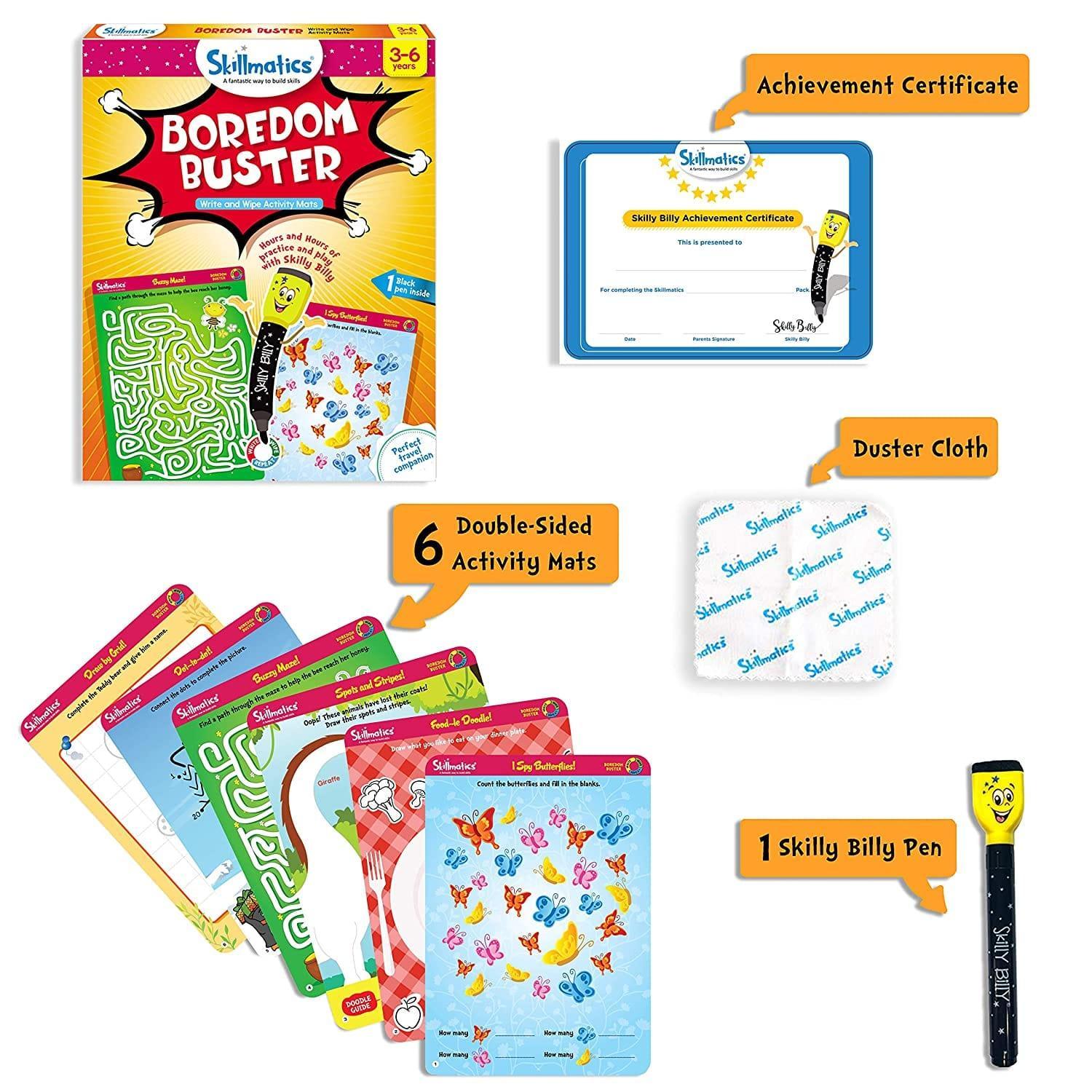 Skillmatics Boredom Buster Junior is a great way to keep kids entertained and learning. It includes 6 double-sided activity mats, 1 Skilly Billy marker, 1 duster cloth, and 1 Skilly Billy Achievement Certificate. Kids can learn through play with 12 highly engaging and repeatable activities that build core skills such as logical reasoning, creative thinking, writing, focus and attention, and observation.
