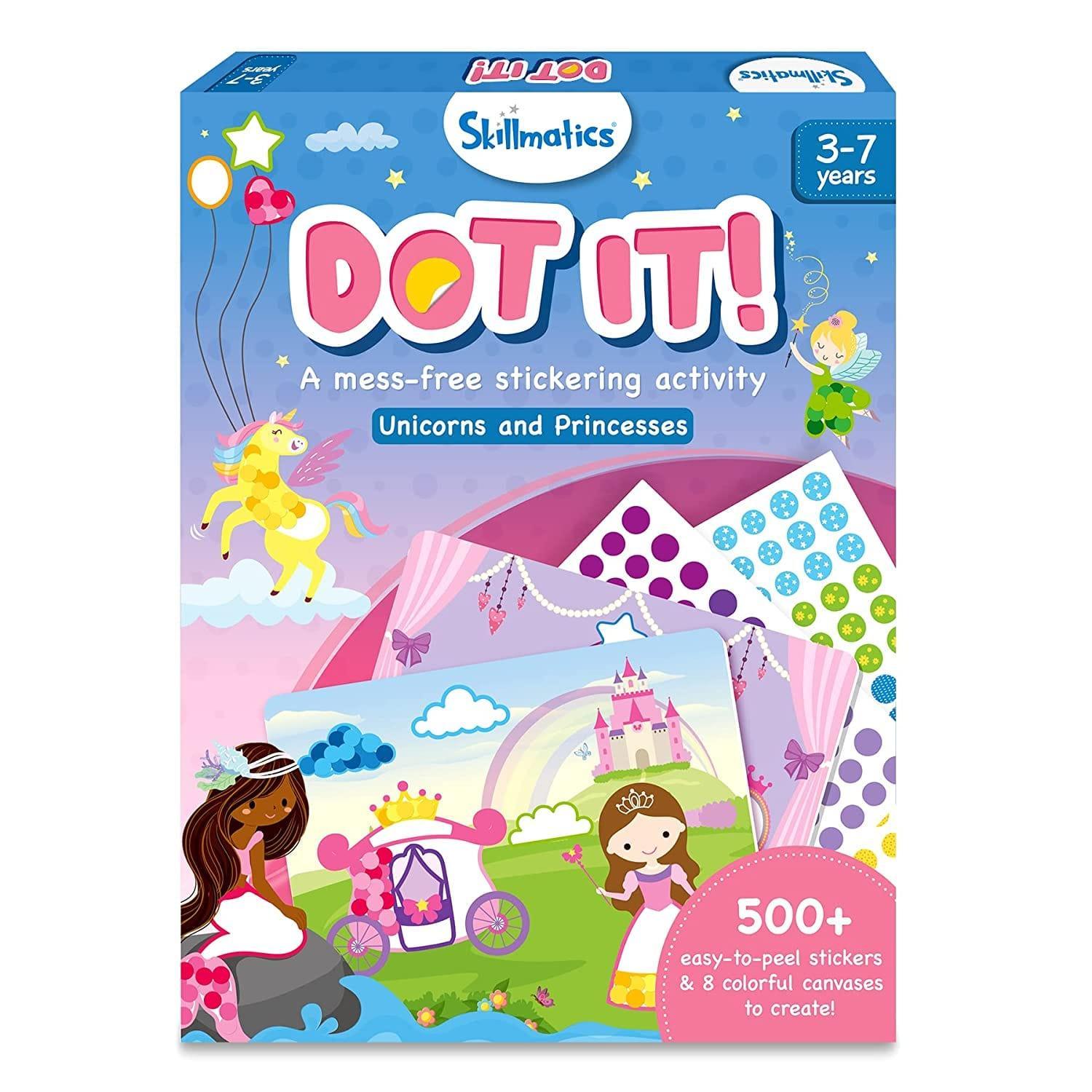 Introducing Skillmatics Dot It Unicorns and Princess! With 500+ easy-to-peel stickers, your child can use their fine motor skills and imagination to complete 8 colorful pictures.