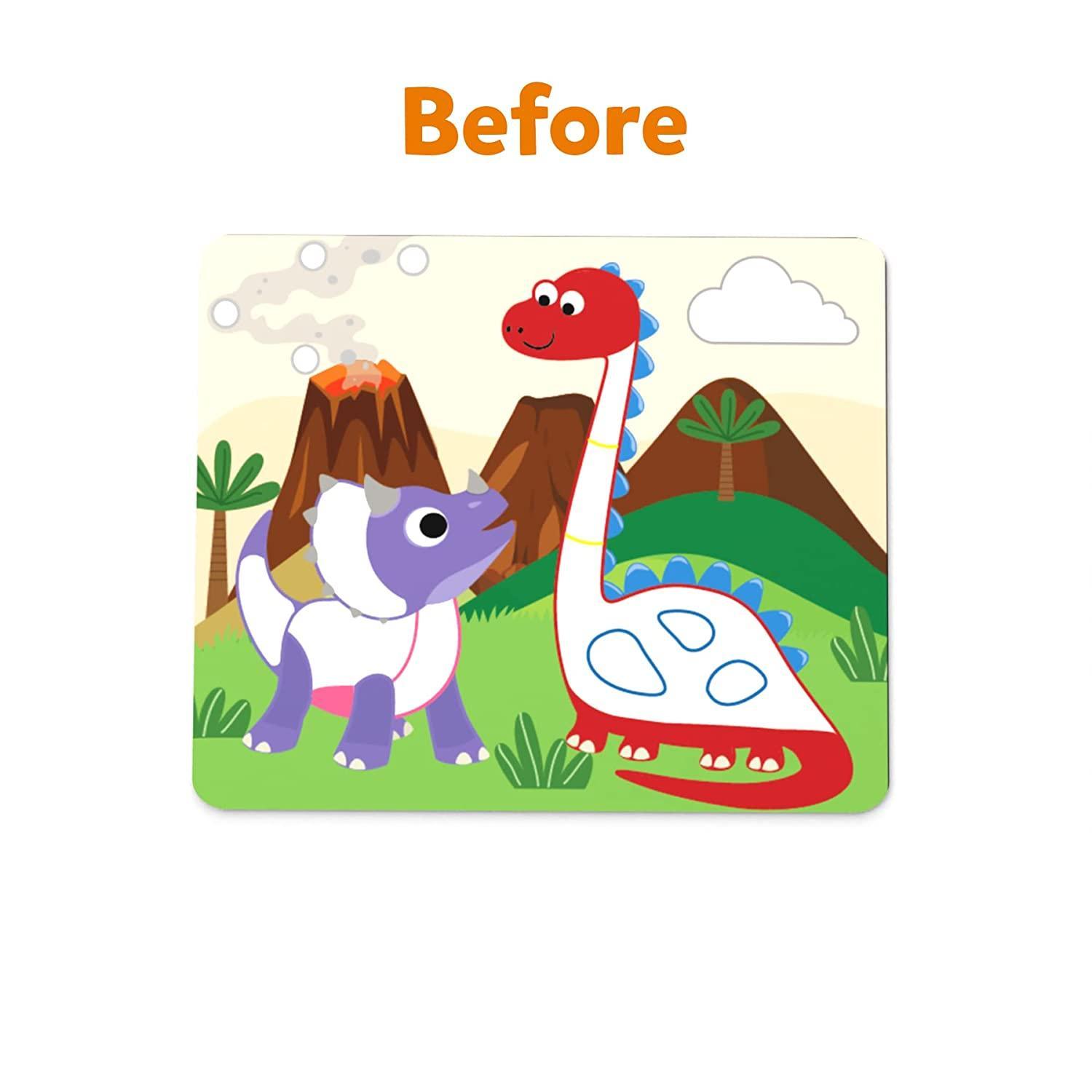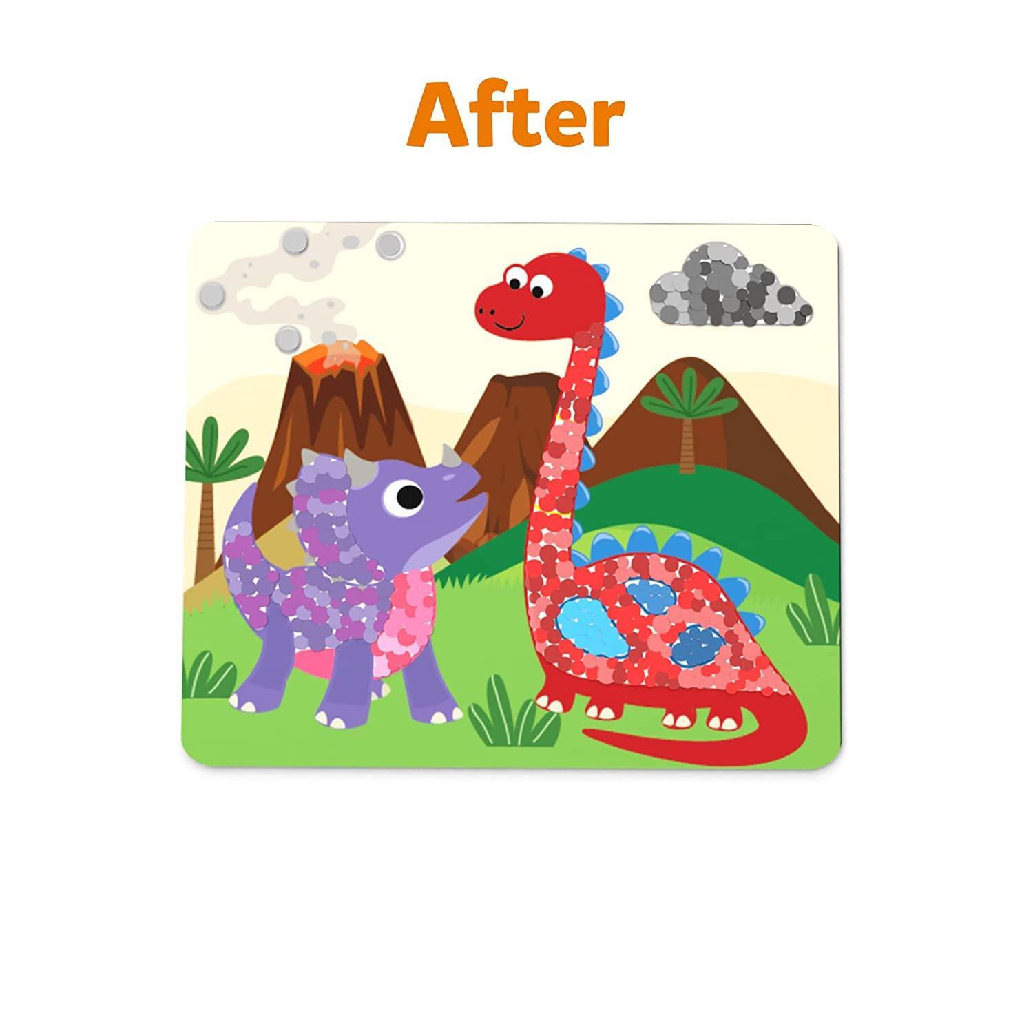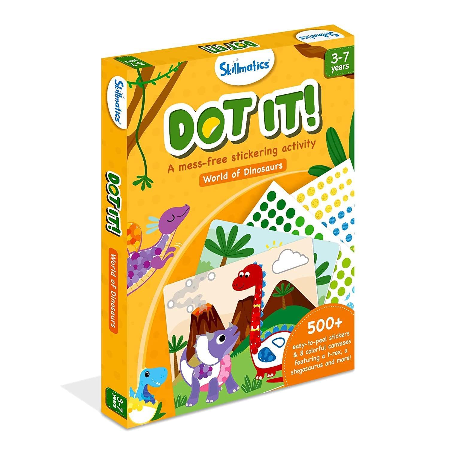 Dot It! World of Dinosaurs is the perfect no-mess art activity for kids aged 3 to 7. With 500+ easy-to-peel stickers, your child can use their fine motor skills and imagination to complete 8 colorful pictures!