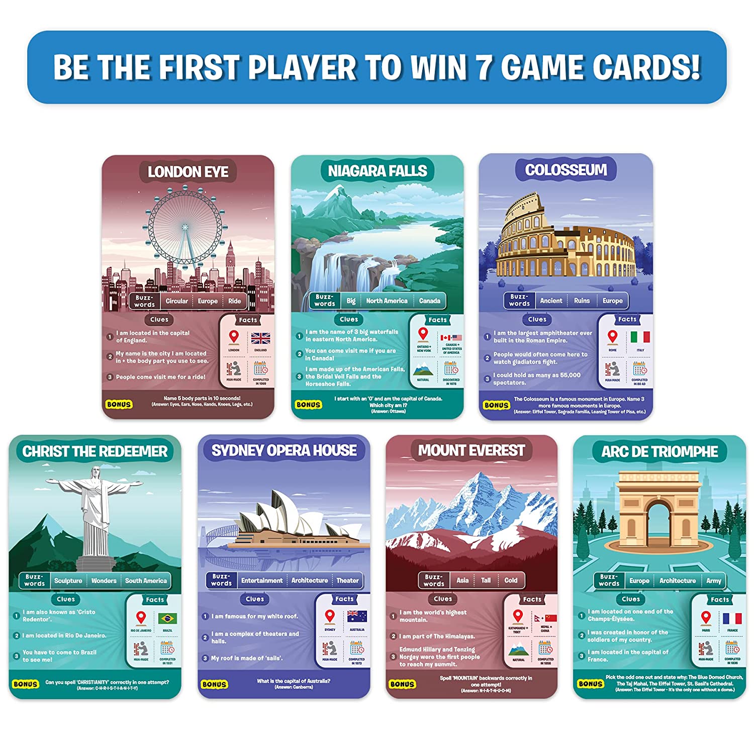 Get ready to play the most exciting game of questions! Ask up to 10 questions to guess the place on the card. Think hard, ask intelligent questions, use your clue cards wisely & be the first person to win 7 game cards!