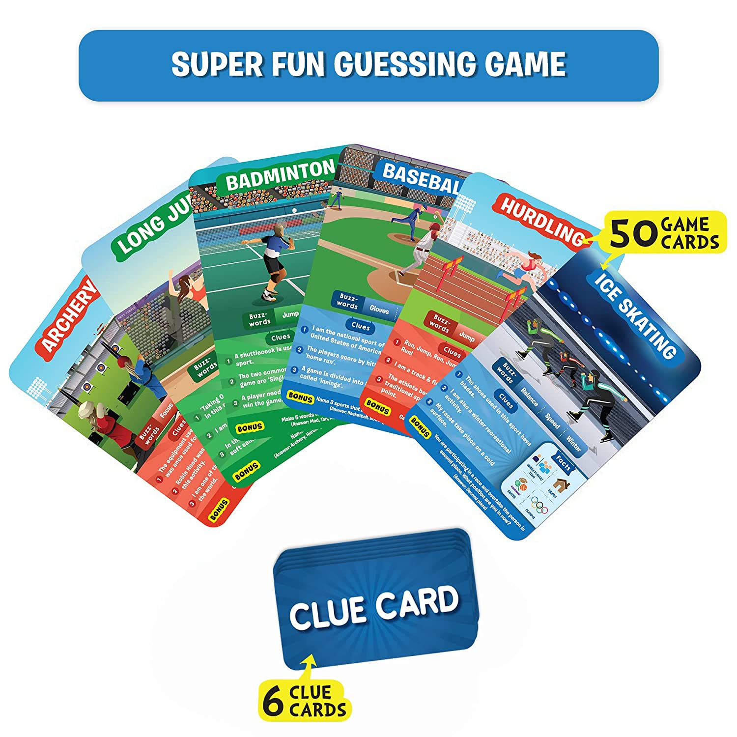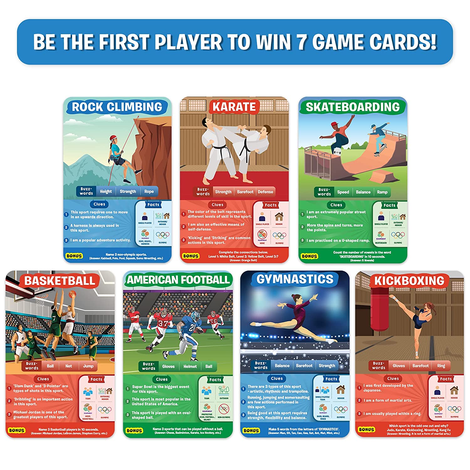QUICK GAME OF SMART QUESTIONS – Divide yourselves up into teams, or play one-on-one, and ask up to 10 questions to guess the sport on the Game Card! Is it played in teams? Is it an outdoor sport? Is it an Olympic sport? Think hard, ask intelligent questions, and be the first player to win 7 Game Cards!