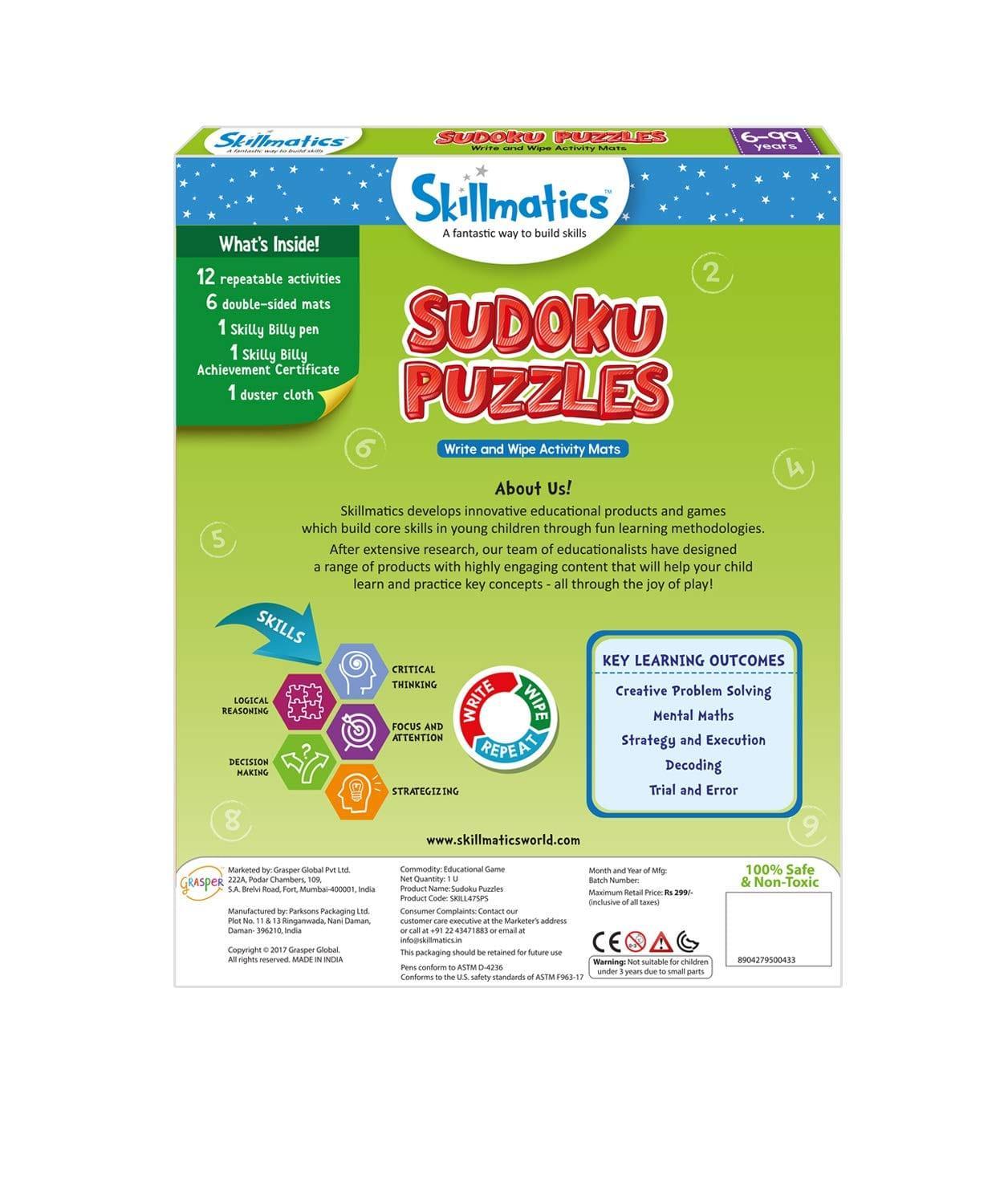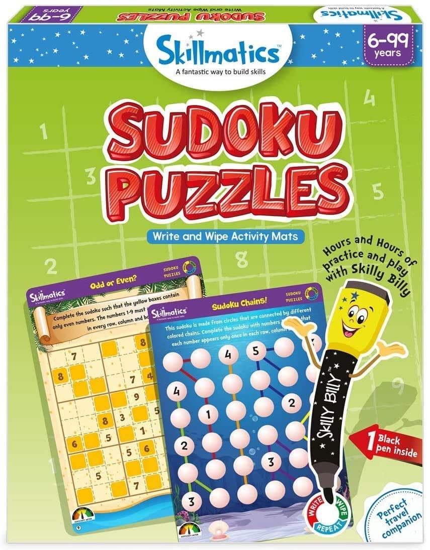 Skillmatics Sudoku Puzzles is an engaging and educational game for kids. It includes 6 double sided activity mats, 1 skilly billy pen, 1 duster cloth and 1 skilly billy achievement certificate. Kids can learn logical reasoning, decision making, critical thinking, strategizing, focus and attention through 12 highly engaging Sudoku puzzles.