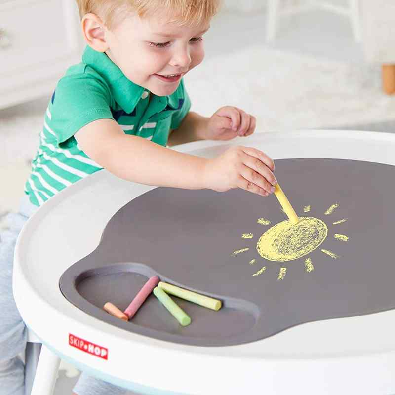 Discovery Window lets baby see piano and their feet while playing to learn cause and effect through spatial awareness. Converts to a play table with smooth plastic chalkboard surface.