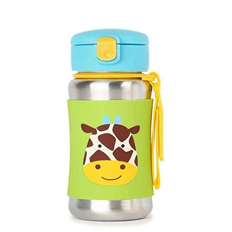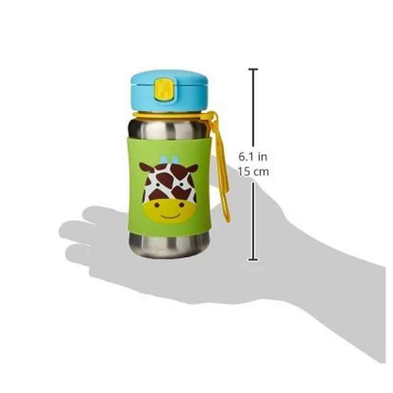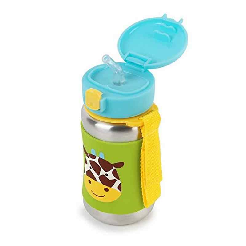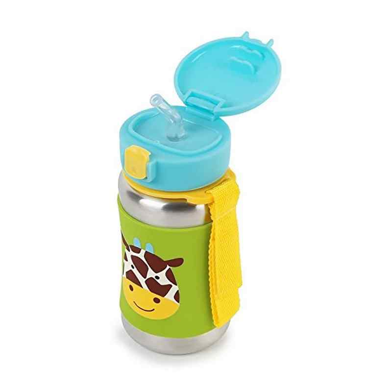 Our kids stainless steel water bottle has a no-slip silicone sleeve to protect little hands from cold surfaces. Featuring our signature Skip Hop Zoo characters, it has a handy grab-me strap that attaches to anything, along with a pop-up lid so the flexible straw stays clean.