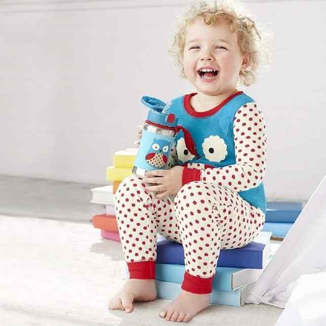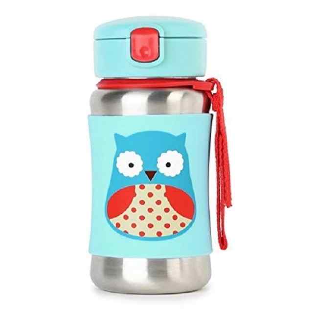 Our kids stainless steel water bottle has a no-slip silicone sleeve to protect little hands from cold surfaces. Featuring our signature Skip Hop Zoo characters, it has a handy grab-me strap that attaches to anything, along with a pop-up lid so the flexible straw stays clean.