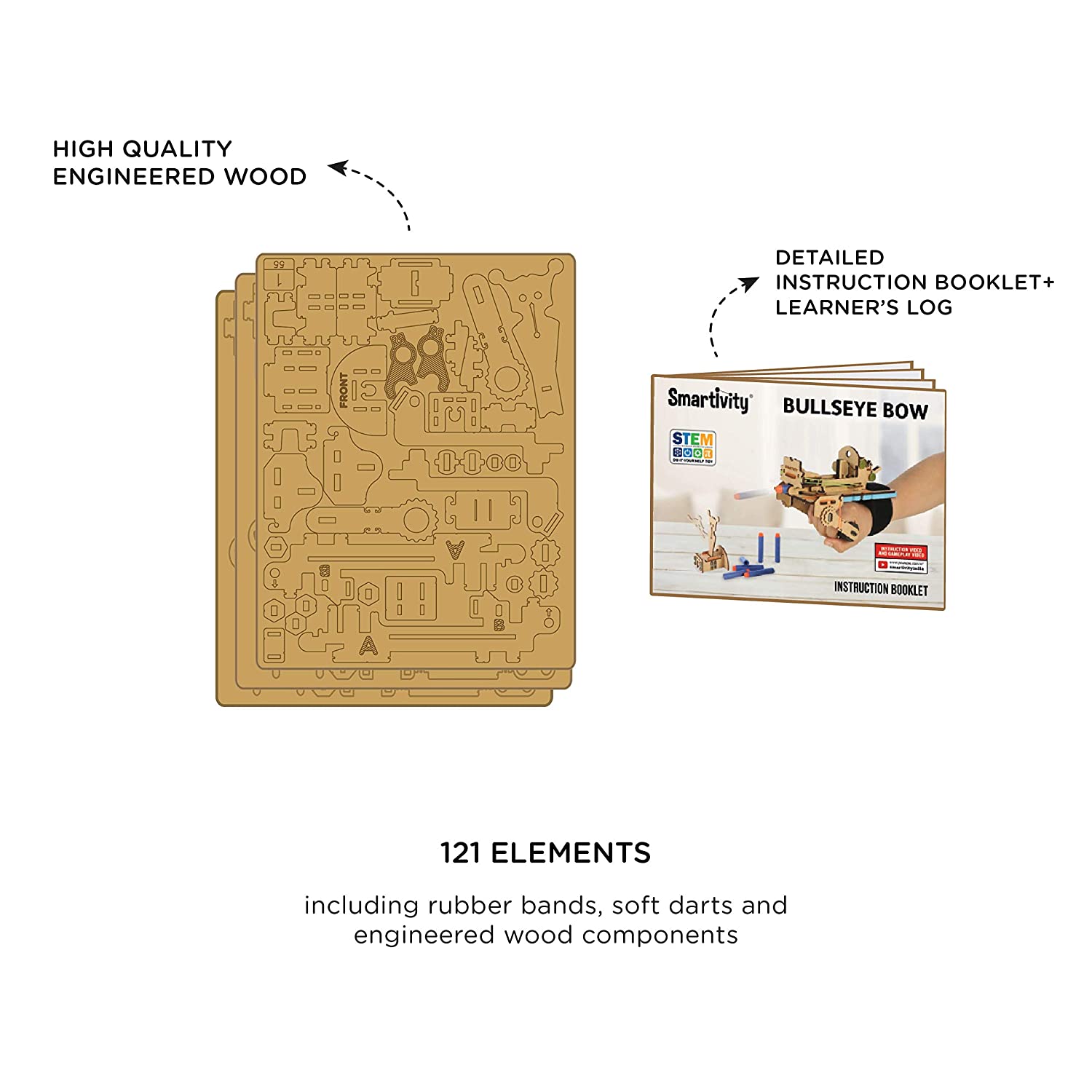 Unleash the archer within you! Using the fun and clear instruction booklet, construct your bullseye bow. Load the soft dart into the bow, aim and knock off the jumping target. Play solo to improve your aim, and challenge your friends to join the fun. Makers will explore the concepts of elasticity, projectile motion and aerodynamic properties of arrows.