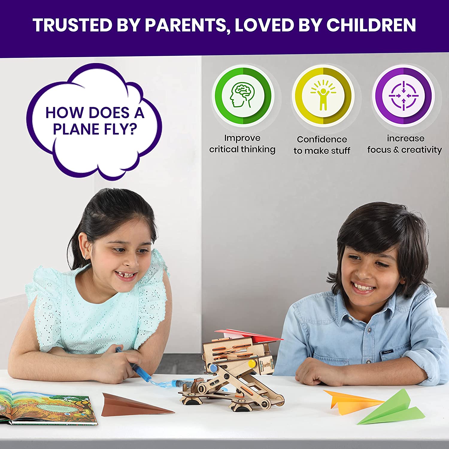 Best Gift for Kids 6-12 yr girls & boys: Build, Play, Learn,153 Parts,BUILD TIME: 120 min, STEM Concepts: aerodynamics,hydraulic systems and scissor mechanism. Screen Free Fun : Longer Constructive Activity,Multiple Gameplays,Core STEAM Learning and Superior Engagement Time Per Rupee than other DIY toys. Children Learn Best Through Play: Smartivity helps in Brain Development of your child with STEAM Concepts based game/toy with Real Moving Parts & MECHANICAL ACTIONS. Trusted By Parents, Loved By Children in 24 Countries (incl USA, Europe): Non-Toxic & Safe. Tested in global labs. Exceeds global toy safety standards. India’s Global Brand. Designed by IIT Alumni in Collaboration With Children: Evaluated and approved for Construction, STEAM Learning and Fun Quotients by Smartivity STEMNinjas. Eco-Friendly, Engineering wood: Imported Premium Pine Wood. Sourced from Responsible Eco-Certified Vendors. “NO SPLINTERS†so that your child is protected. No Mess, No Tools Needed for assembly for a clean, MESS-FREE HOME, Elastic Bands joinery, Easy to Disassemble and Reassemble.