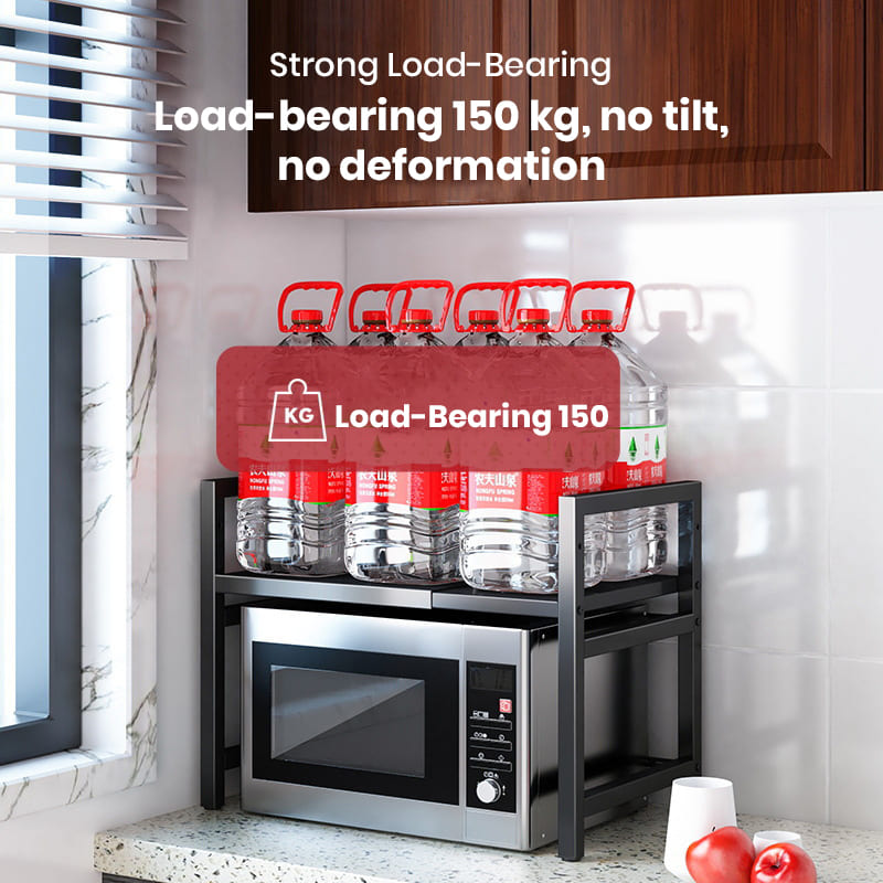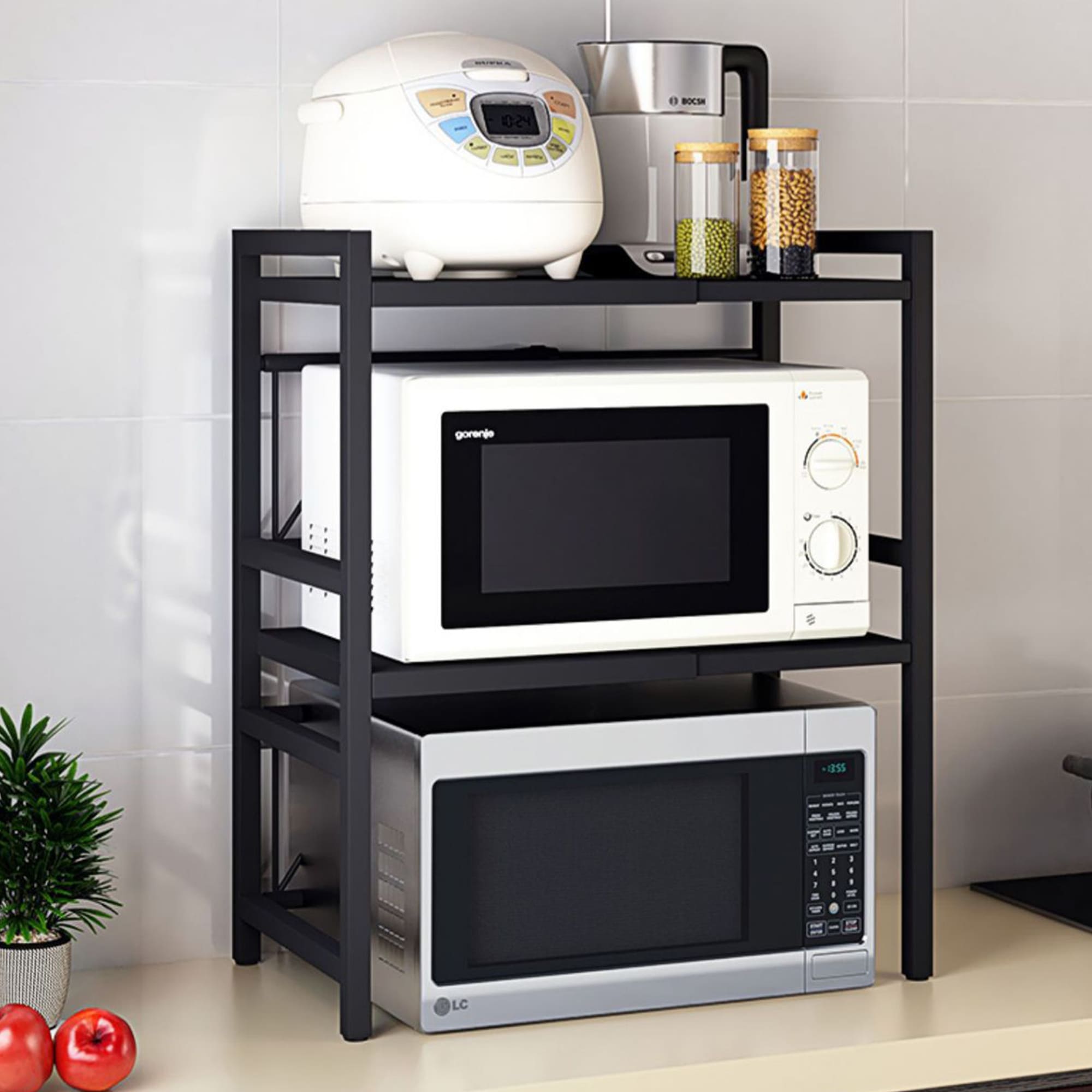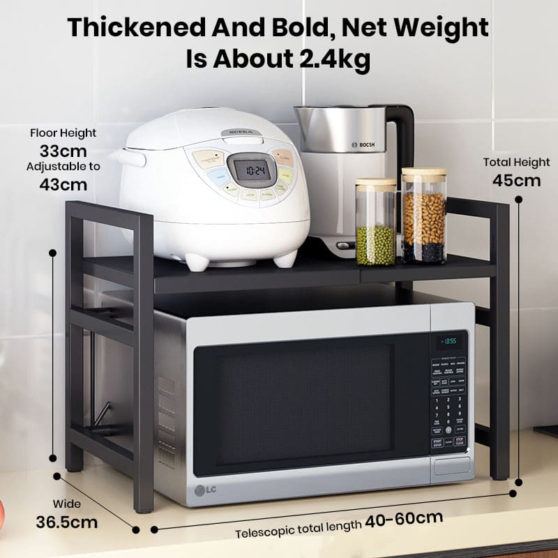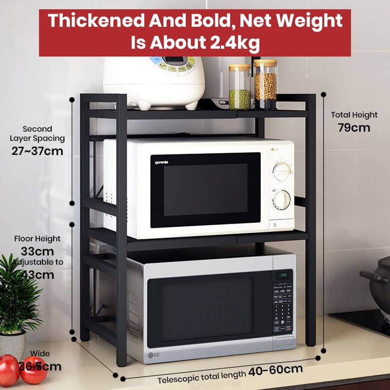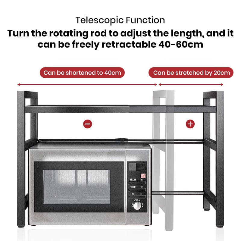 Made of sturdy metal with a sleek black finish, this 2-tier shelf is expandable from 40cm to 60cm, making it suitable for a variety of countertop sizes. The top tier is perfect for holding your microwave oven, toaster, or other small appliances, while the bottom tier provides ample space for storing plates, bowls, and other tableware.