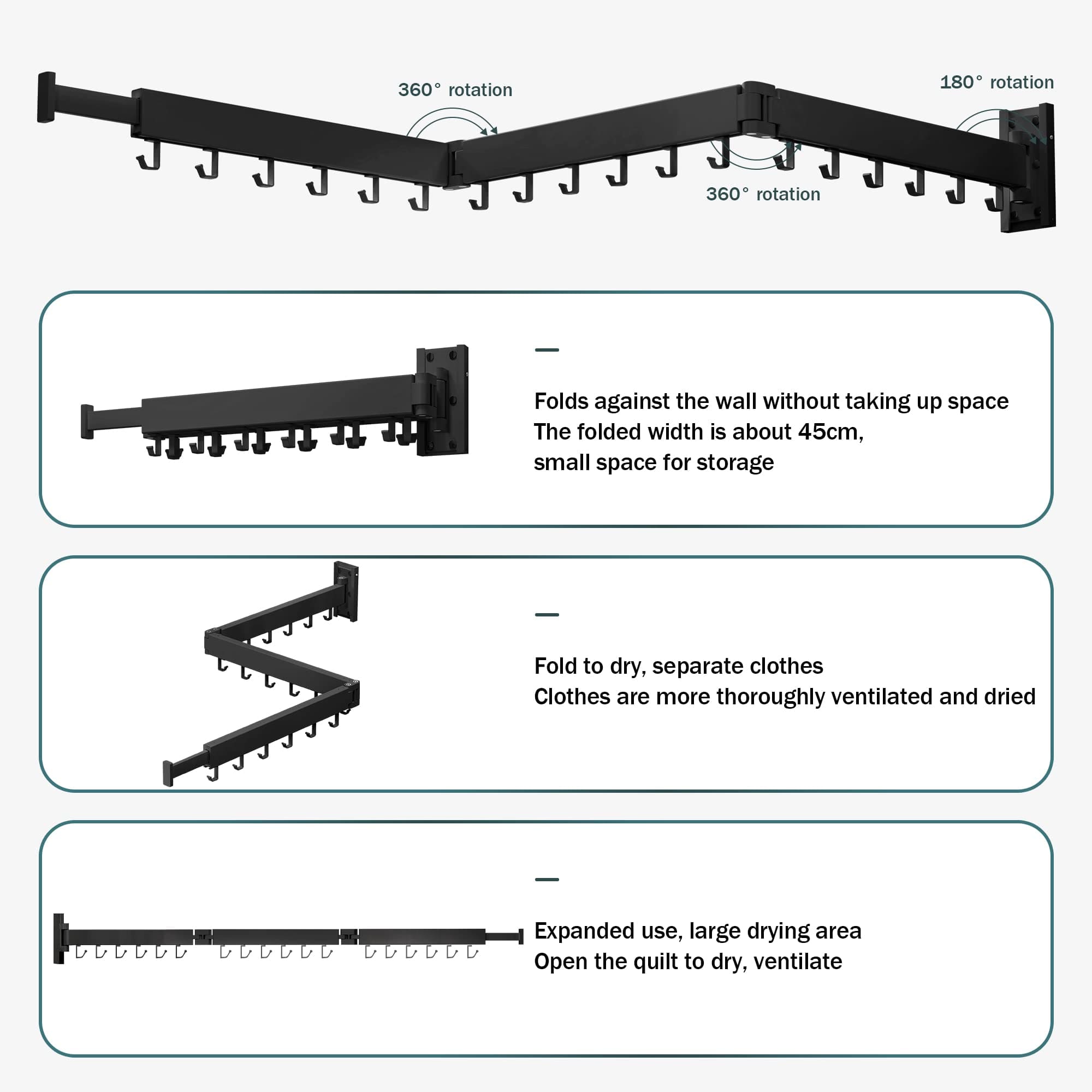 SND Home Wall Mounted Folding Clothes Drying Rack, Collapsible and Retractable Space Saver Heavy Duty Laundry Drying Rack with Towel Bar (Black)