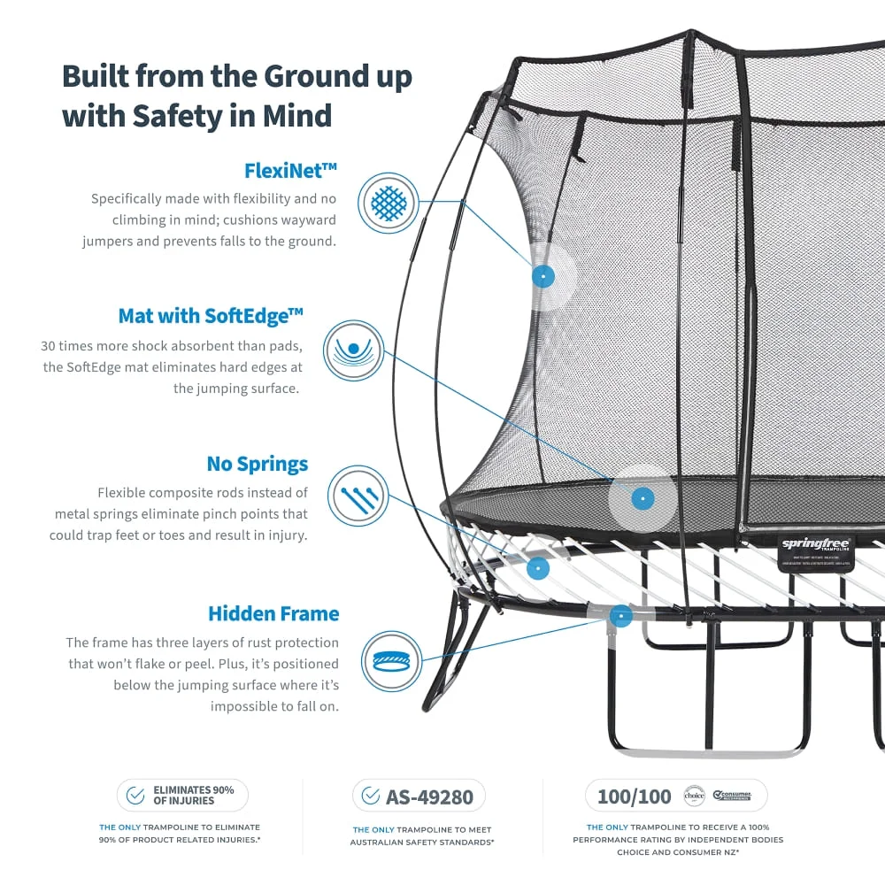 Springfree Trampoline is the world’s safest trampoline featuring no springs, no hard edges, a flexible enclosure, and a frame where it’s impossible to fall on.
