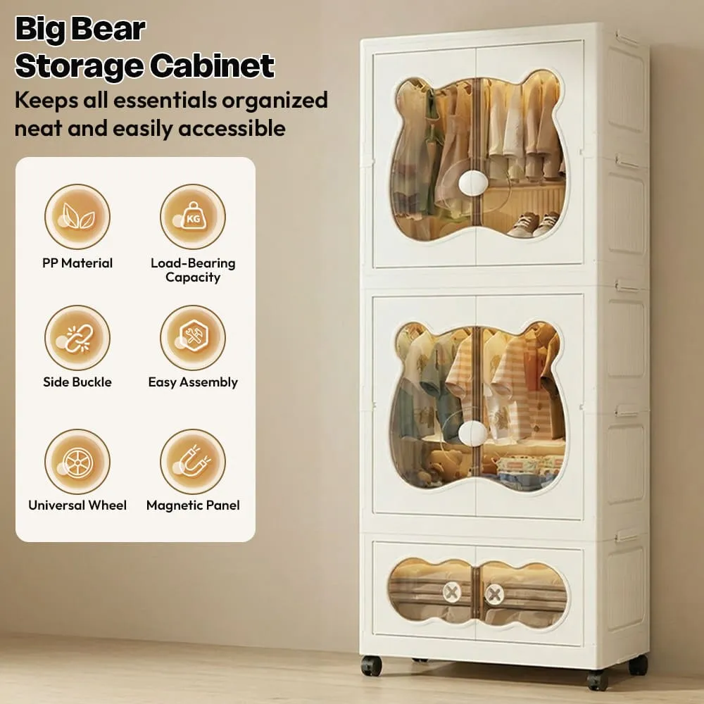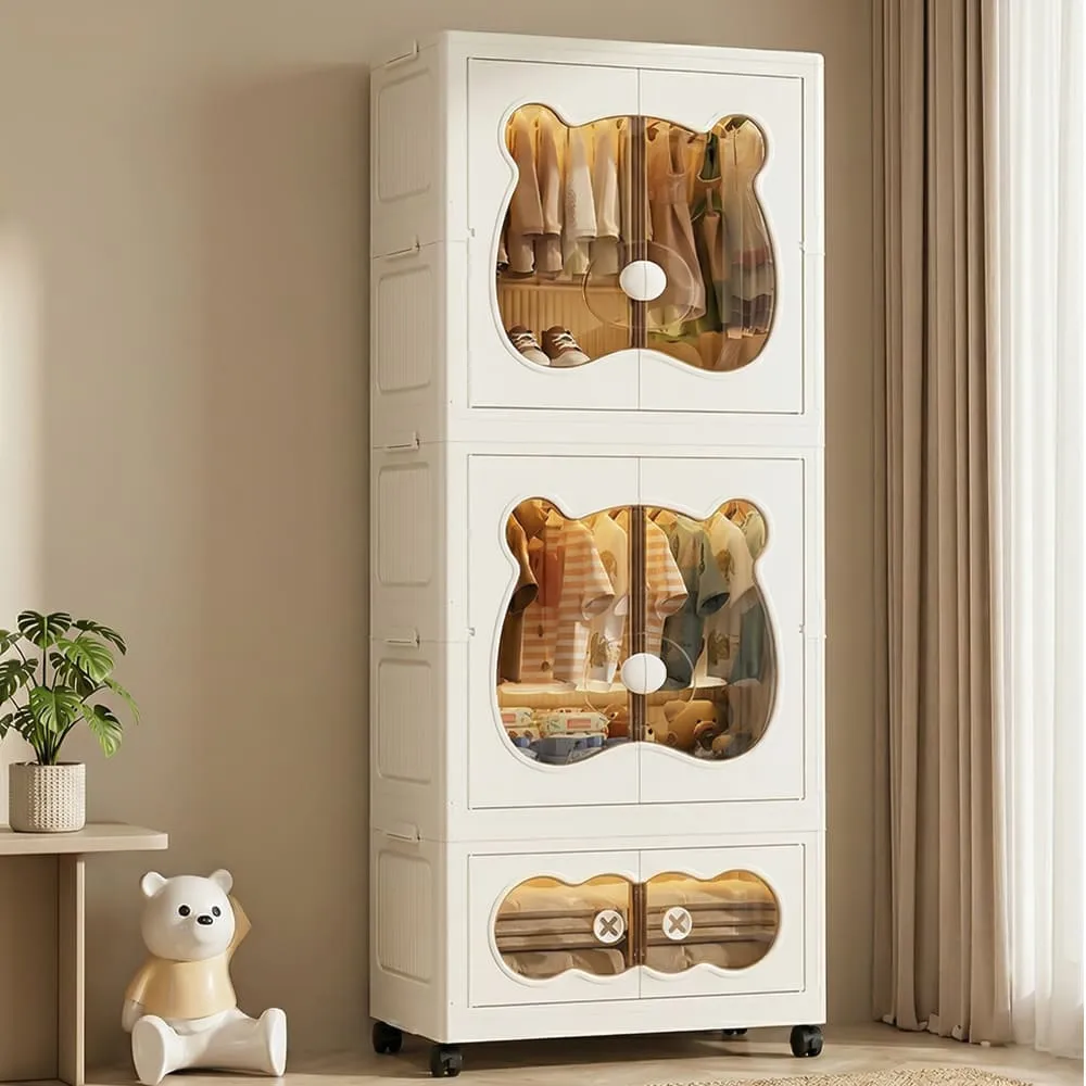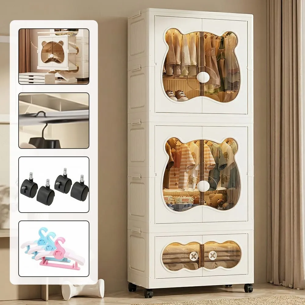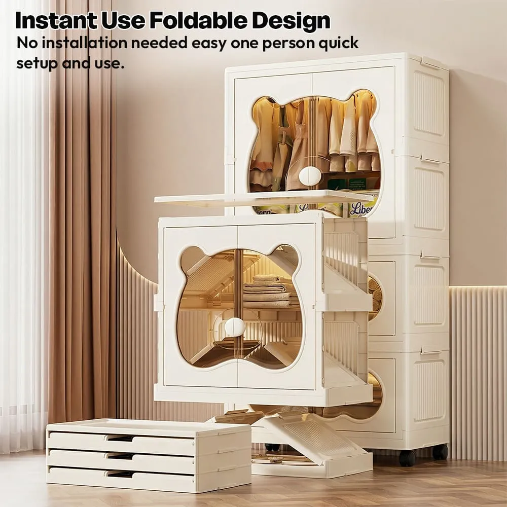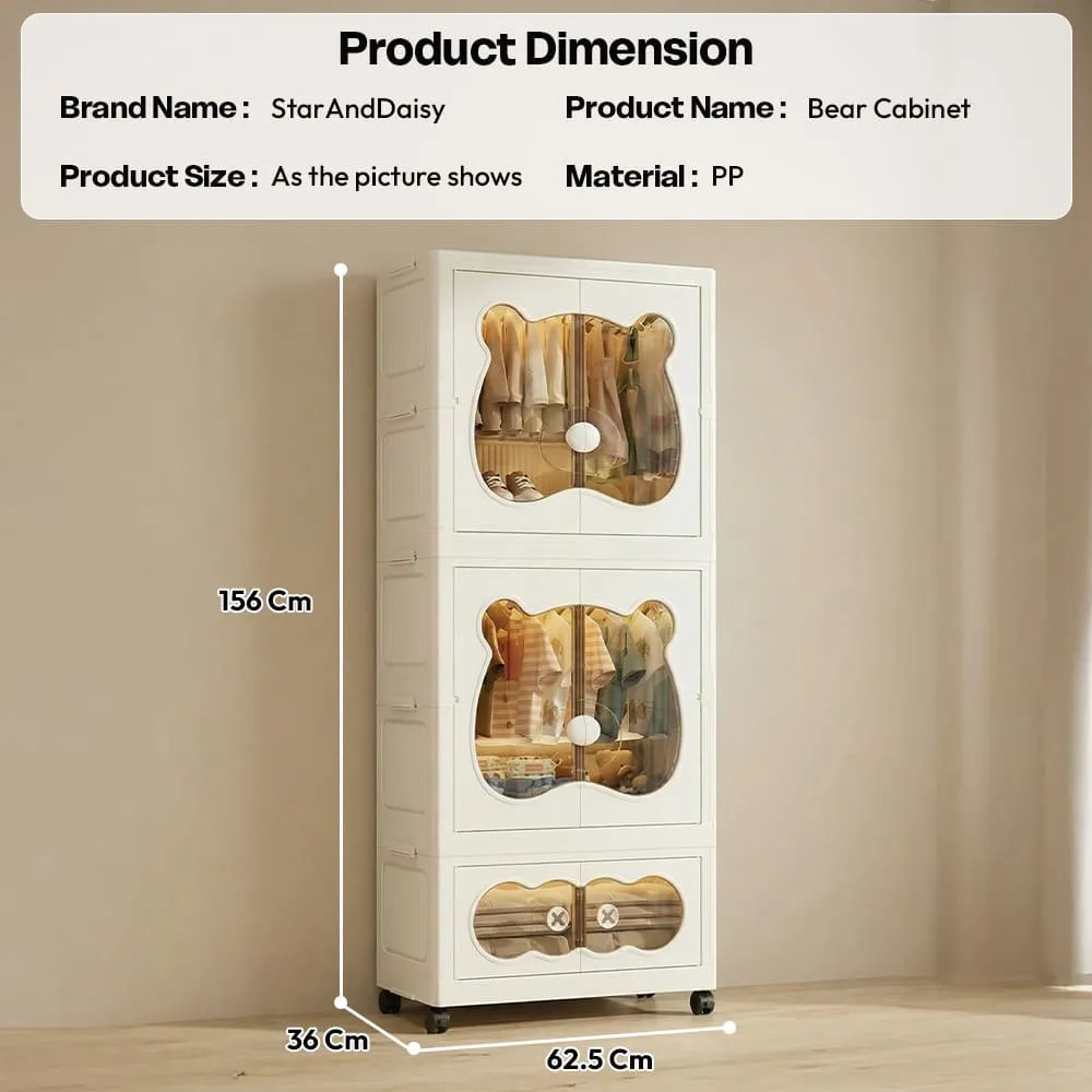 StarAndDaisy 3-Layer Cartoon Bear Kids Wardrobe, Foldable Plastic Baby Clothes Organizer with Wheels, Collapsible Children Clothing & Toy Storage Cabinet