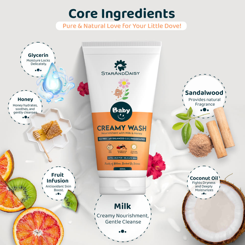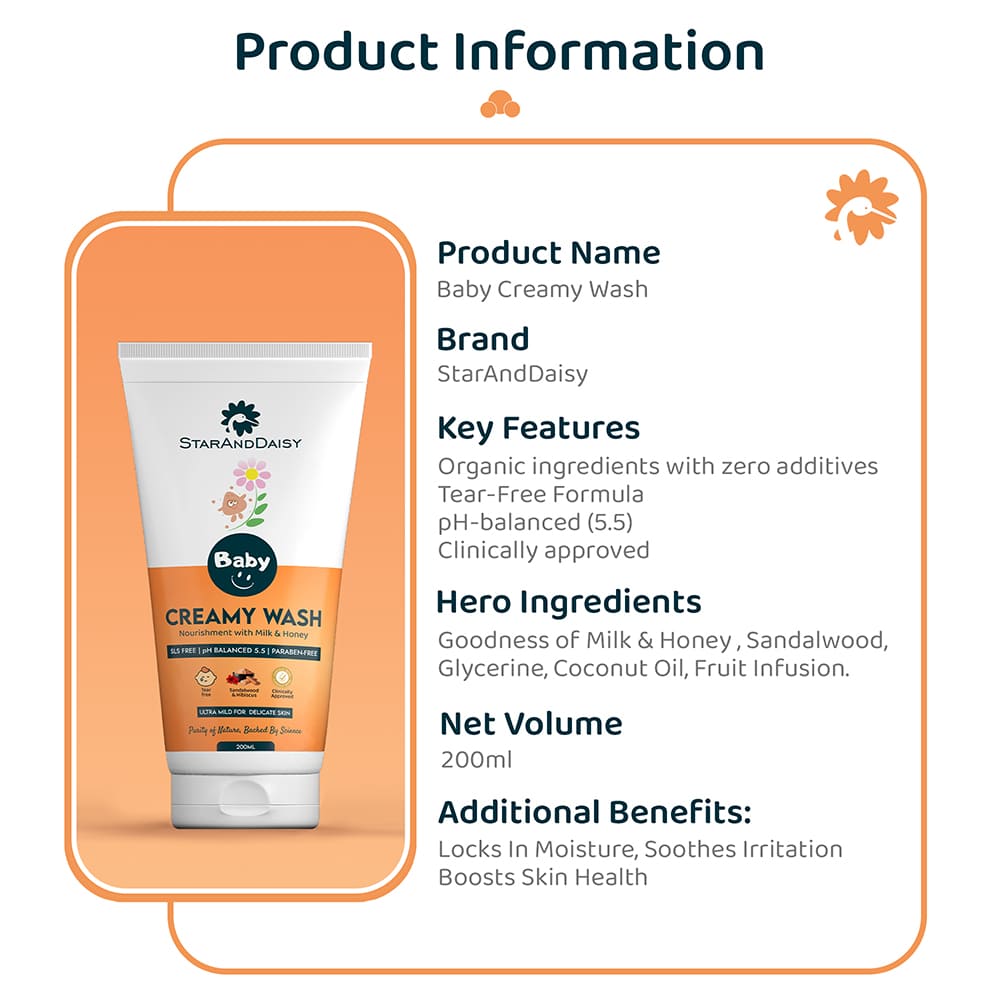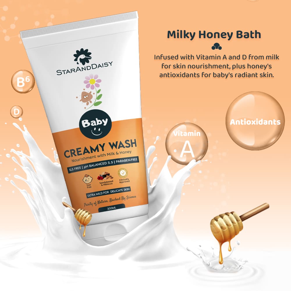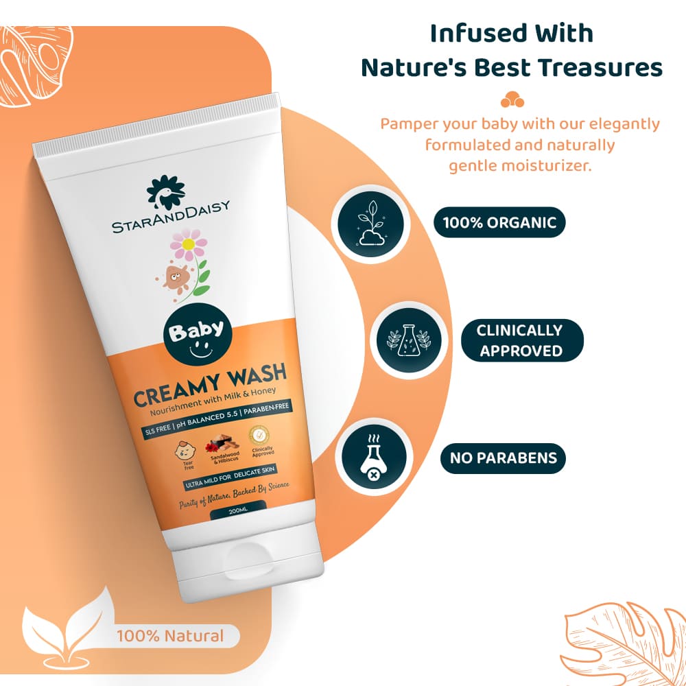Meanwhile, Indulge the baby in pure care with StarAndDaisy moisturizing baby wash, specially crafted for delicate skin. Our gentle formula, Supplemented with the goodness of milk and honey, ensures a nourishing also relaxing bath experience.