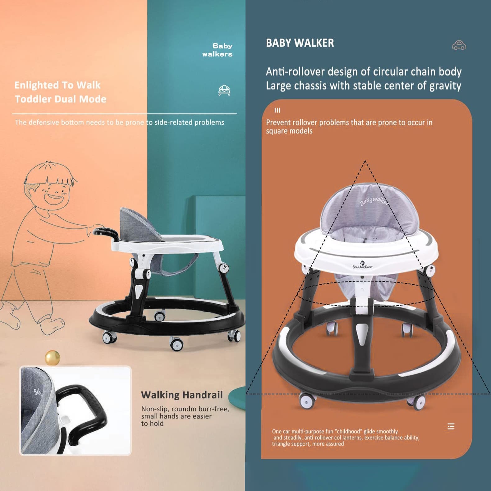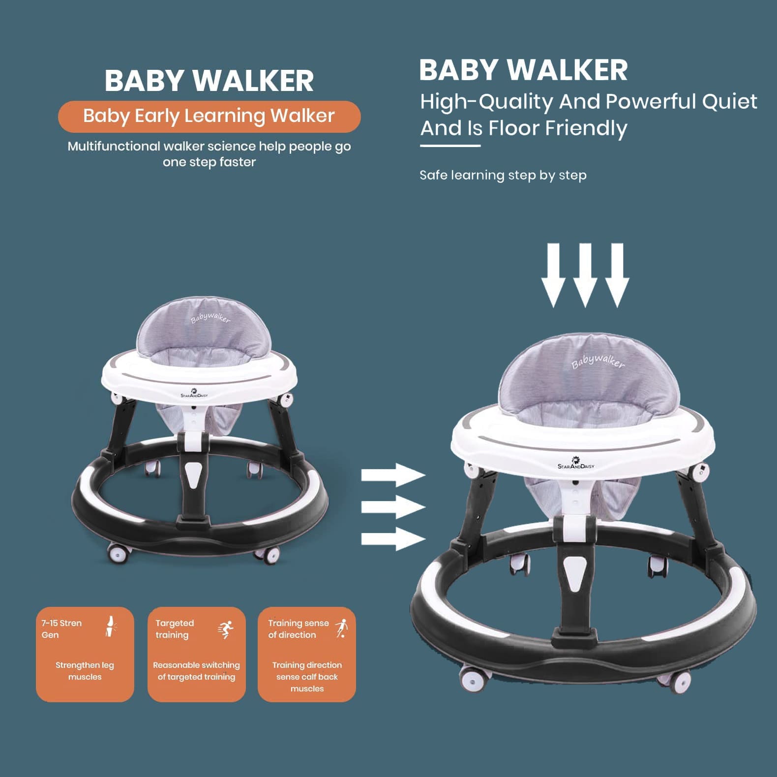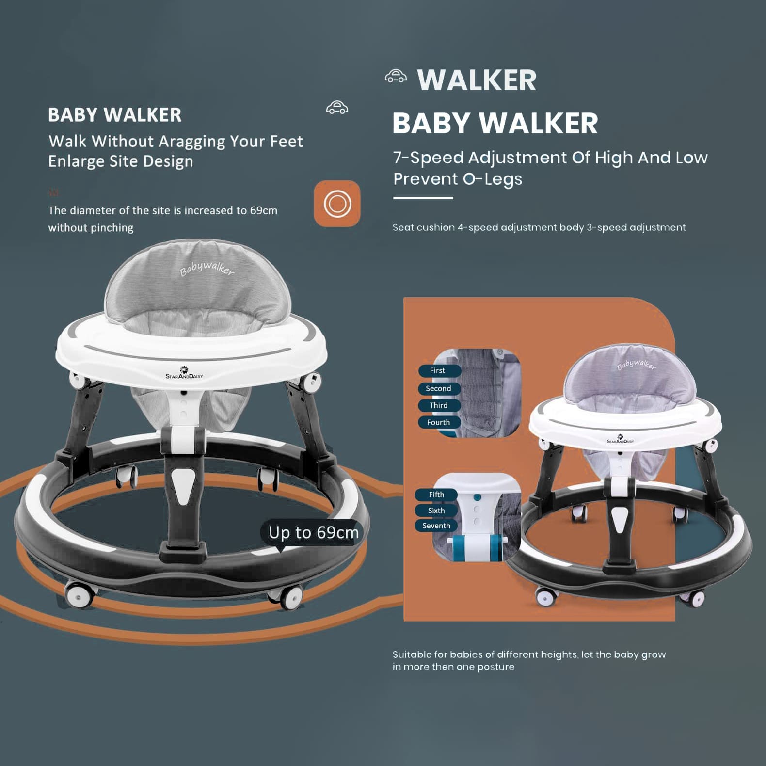 StarAndDaisy Foldable Baby Walker with Height Adjustment & 360° Wheels, Padded Seat for 6-24 Months Babies without Toy Tray – Black