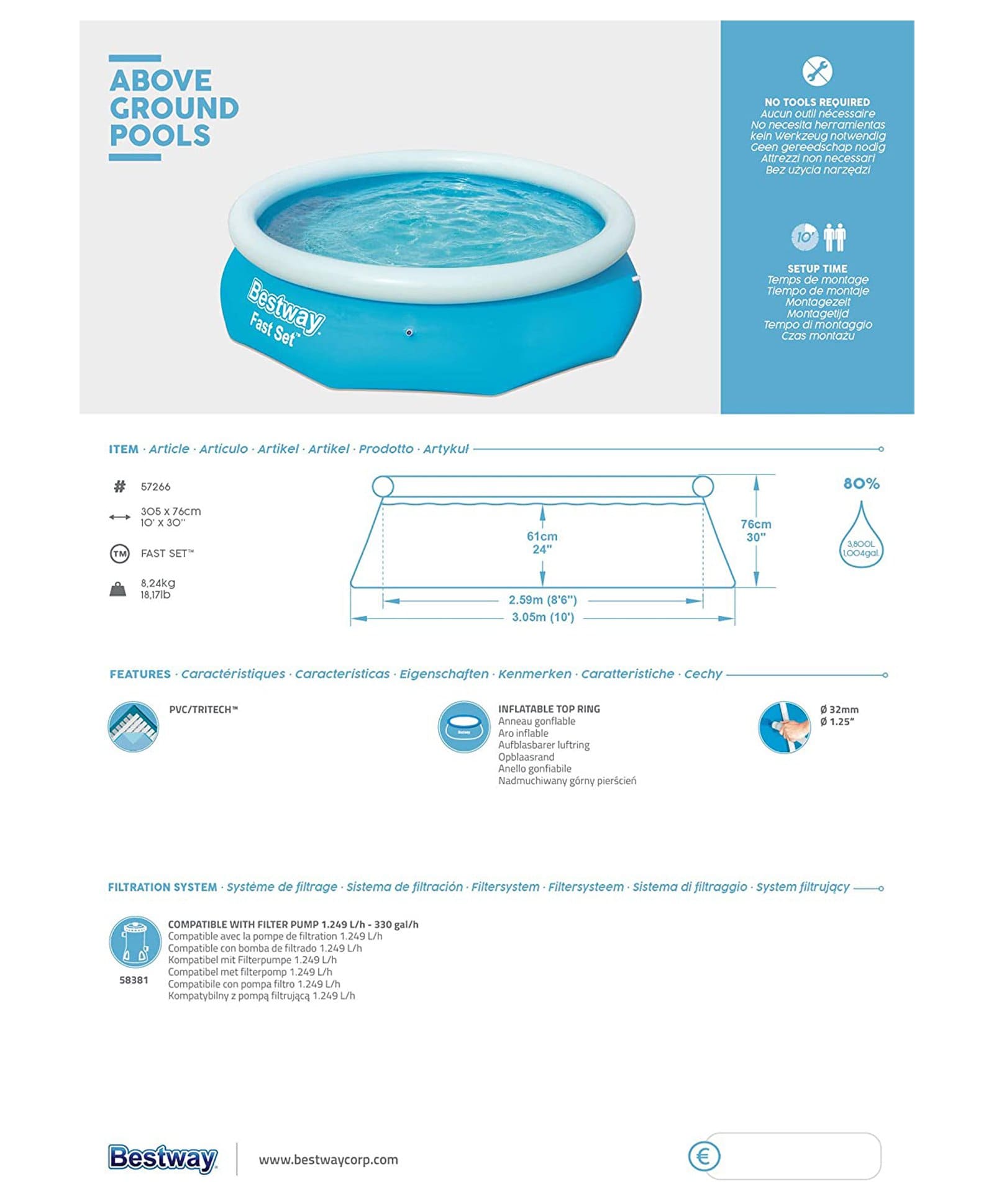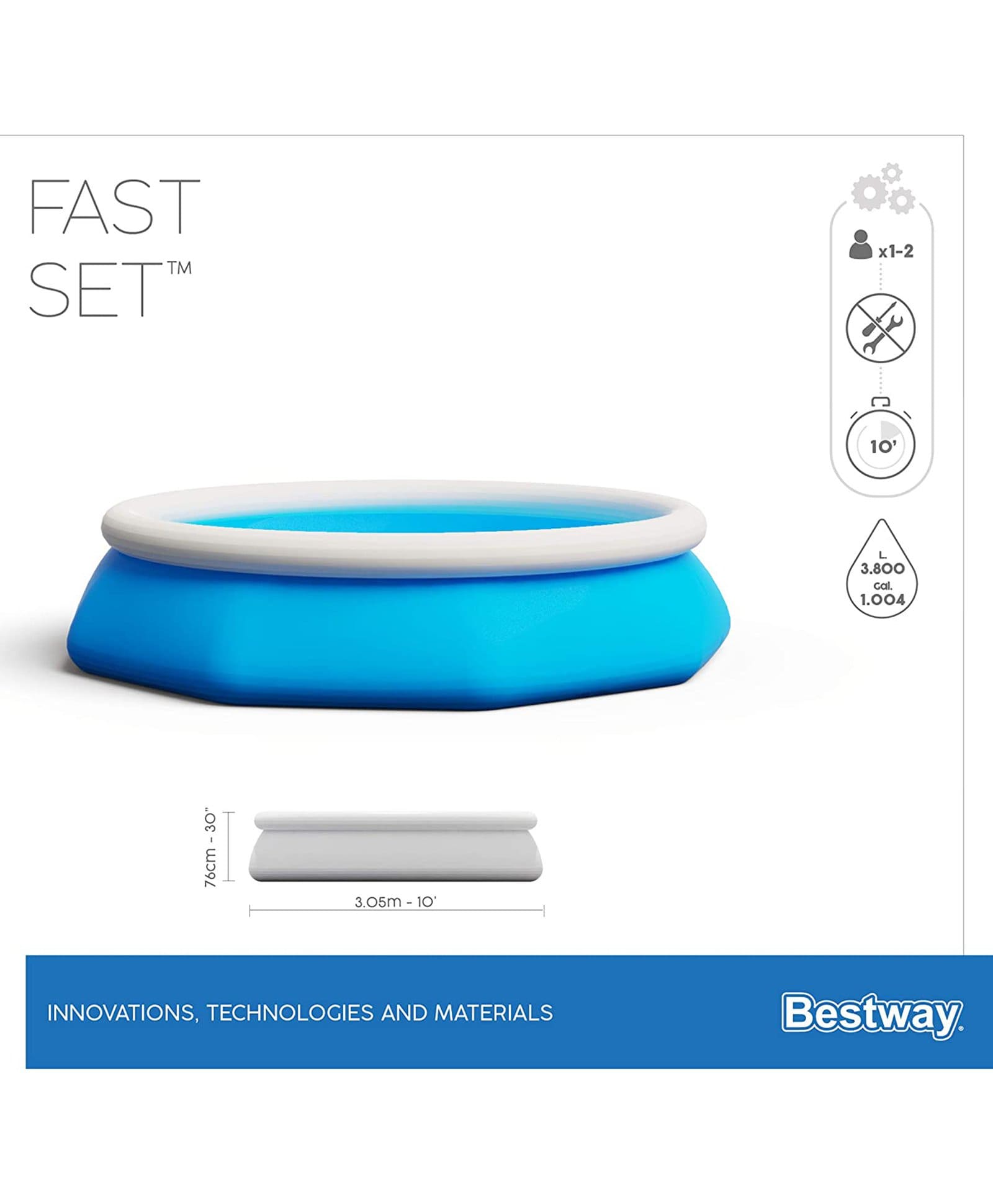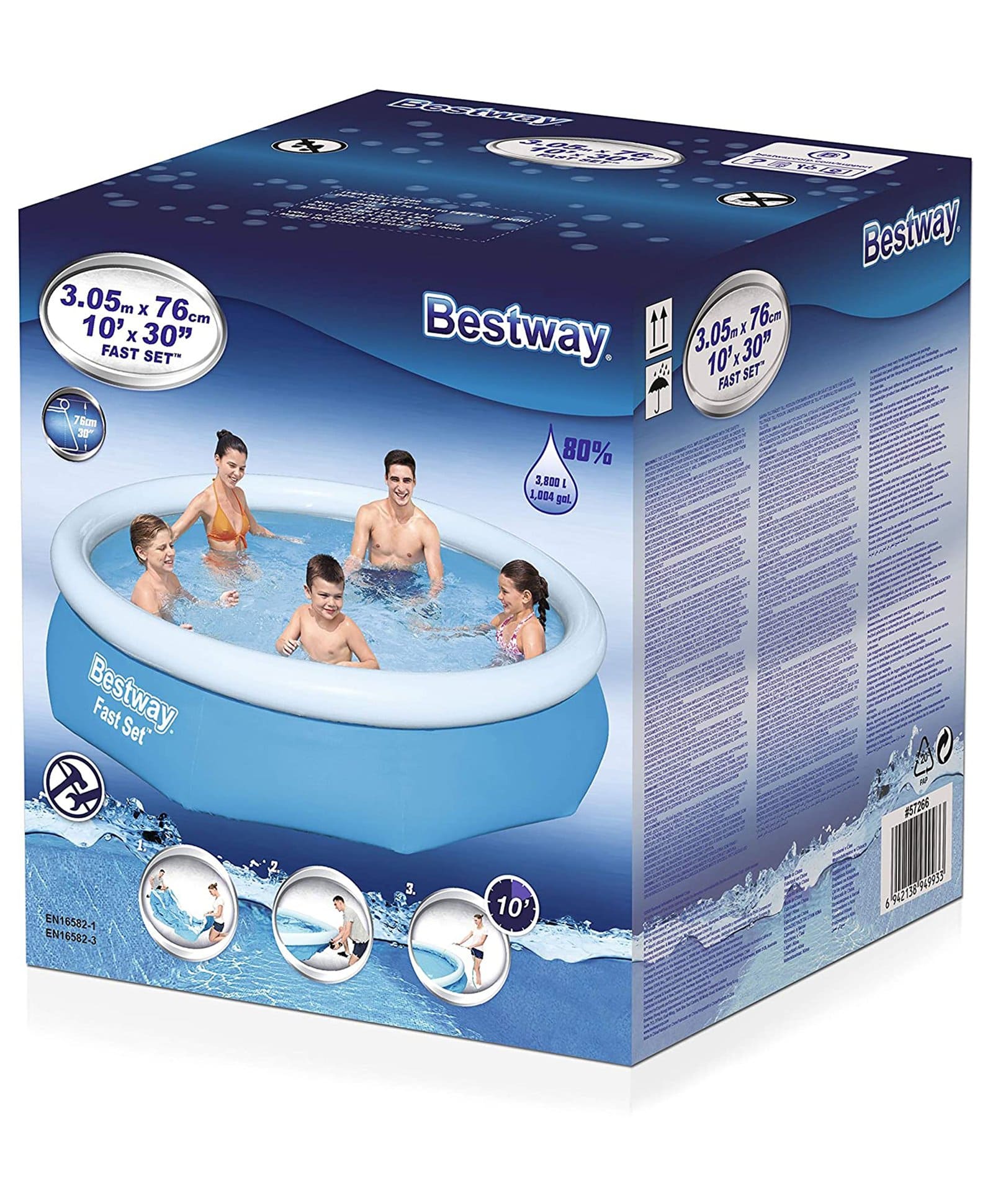 Name: Bestway 3.05 Meter Pool (10 feet)Get the kids outdoors and active with the 10 ft fast set Paddling Pool. Requires no tools to construct so the kids will be splashing about in their pool in no time. Constructed using TriTech, the 10 ft fast set Paddling Pool benefits from a three-layer reinforced material that delivers superior strength and durability for continued enjoyment all summer. The pool also comes with an adhesive repair patch in case of any mishaps. The pool includes a built-in flow control drain valve which makes it very easy to drain. Simply attach the valve to a garden hose with an included adapter to drain away the water somewhere convenient.