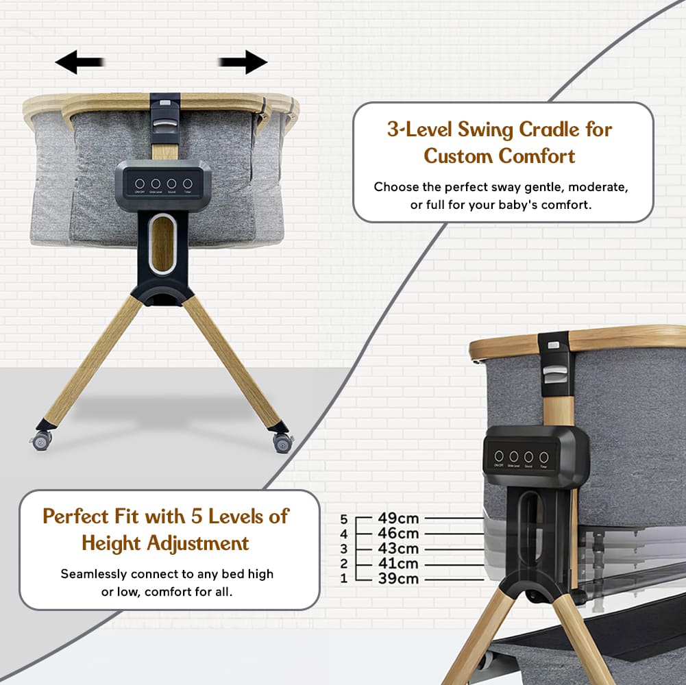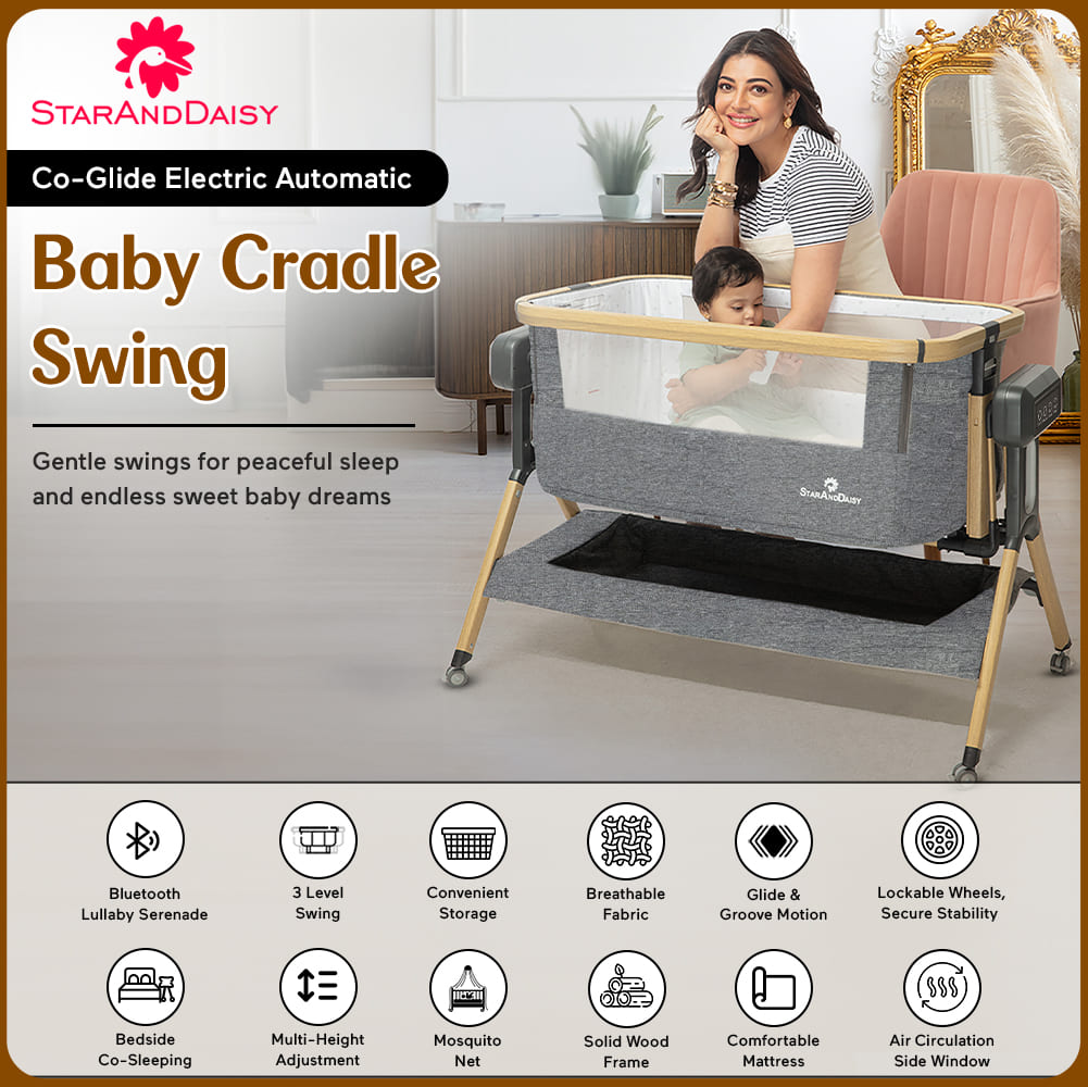 StarAndDaisy Co-Glide Electric Automatic Baby Cradle Swing, Cradle Co-Sleeper Baby Cradle With Multi-Height Adjustment, Stylish Wood Finish Legs, Mosquito Net Protection For Newborn Baby to 2 Years