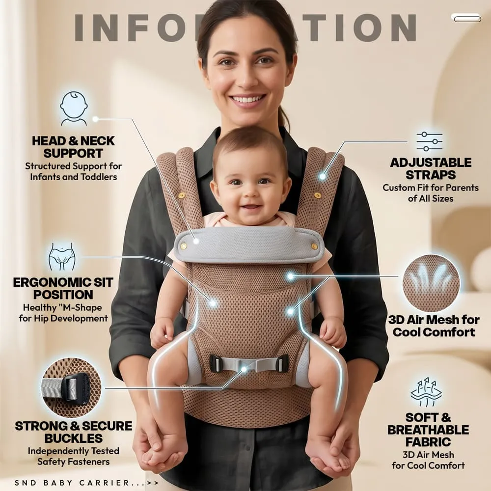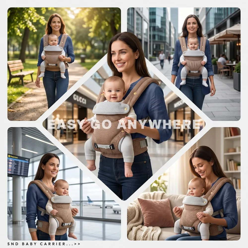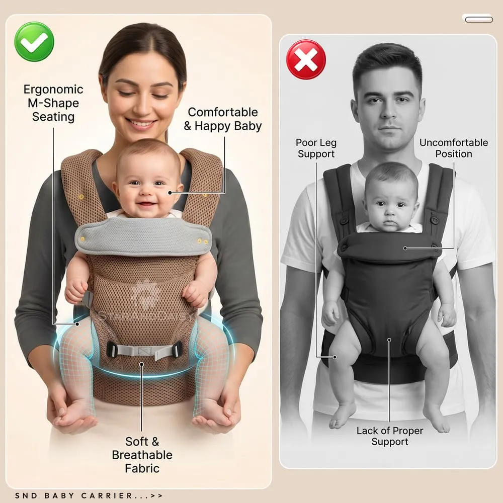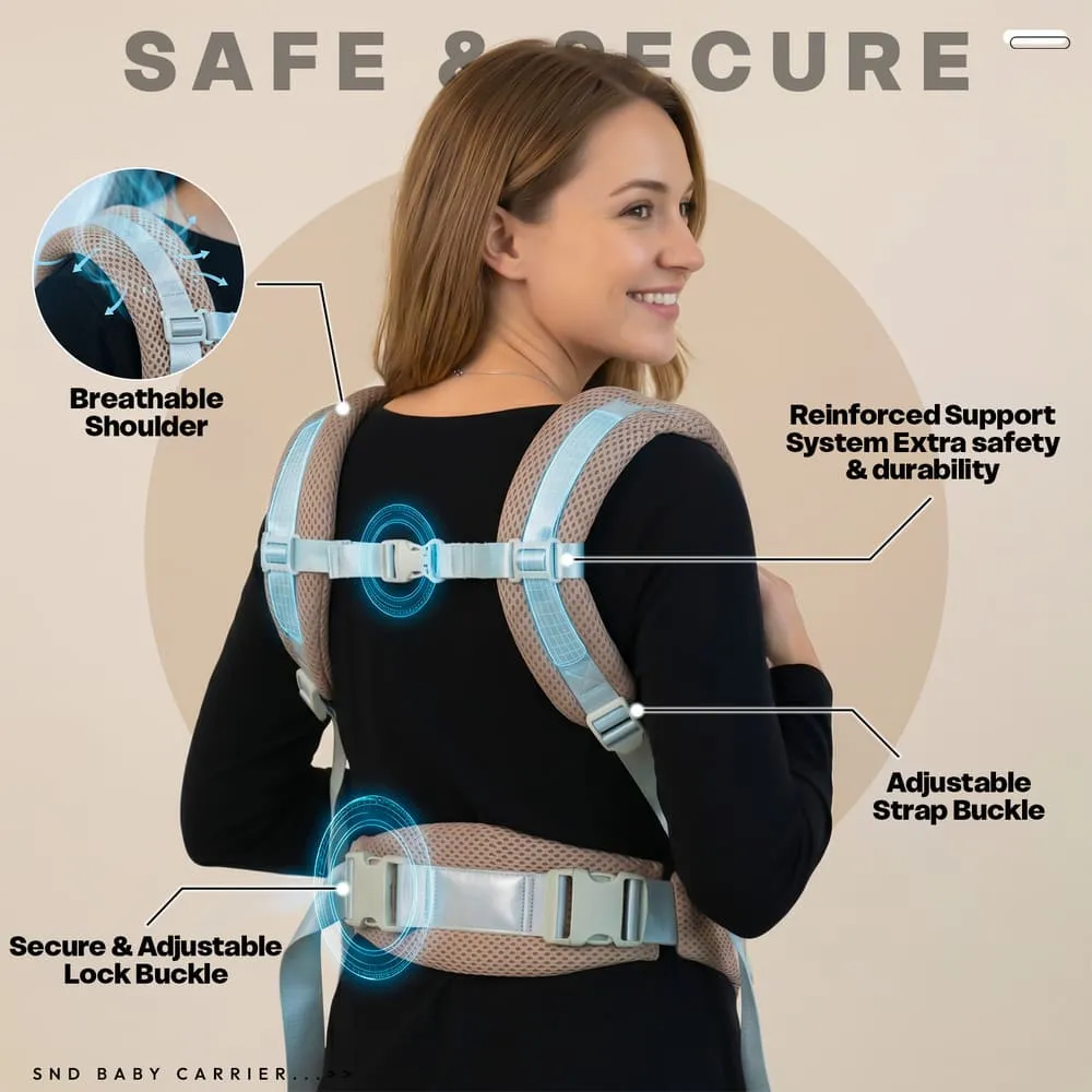 Made with high-quality breathable mesh fabric, this lightweight Baby Carrier allows maximum airflow, preventing heat buildup and keeping your baby cool and comfortable even during long hours of use. The soft padded shoulder straps and reinforced lumbar support evenly distribute weight, reducing strain on your back, neck, and shoulders—making it one of the best baby carriers for travel, shopping, walking, and daily use.