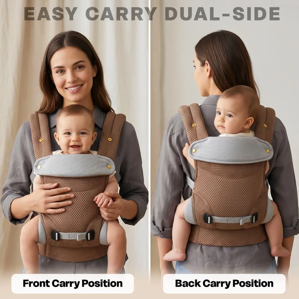 The adjustable straps and secure locking buckles provide a snug and customized fit for different body types, ensuring both safety and ease of use. Designed for convenience, this multi-position baby carrier supports both front carry (inward-facing) and back carry positions, giving parents flexibility based on their baby’s age and comfort.