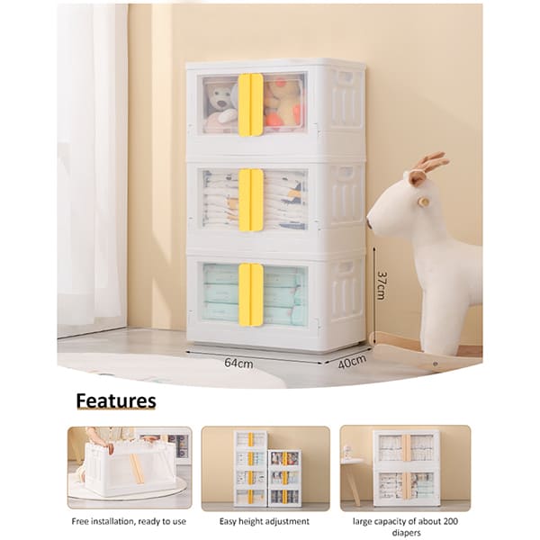 StarAndDaisy Foldable Toys Storage Box *No Assembly Needed* Clear Plastic Stackable Kids wardrobe organizer cupboard cabinet, Double door front opening (3 stackable cuboids | 72 Lt)
