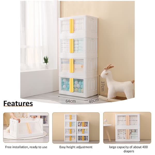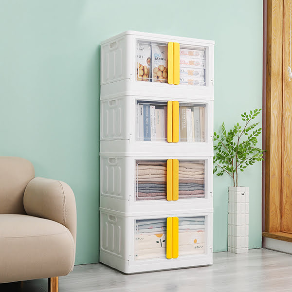 StarAndDaisy Foldable Toys Storage Box *No Assembly Needed* Clear Plastic Stackable Kids wardrobe organizer cupboard cabinet, Double door front opening (4 stackable cuboids | 72 Lt)