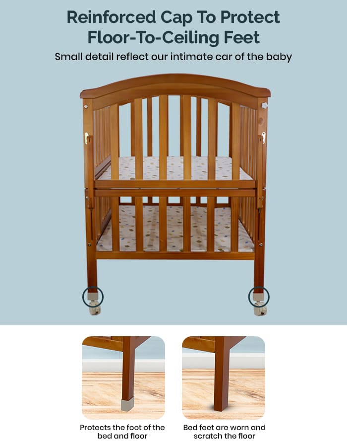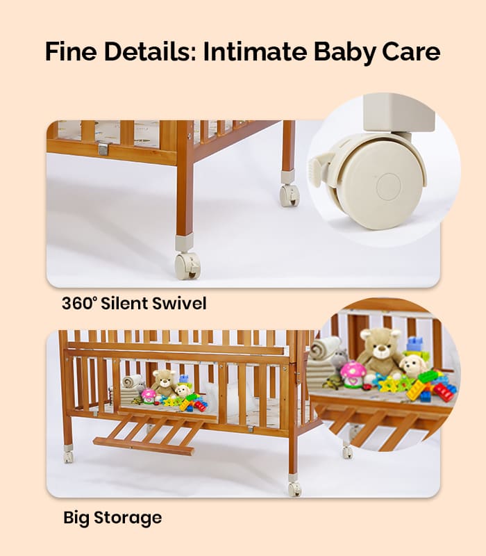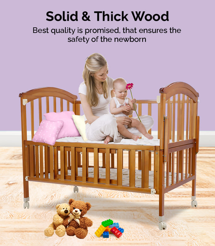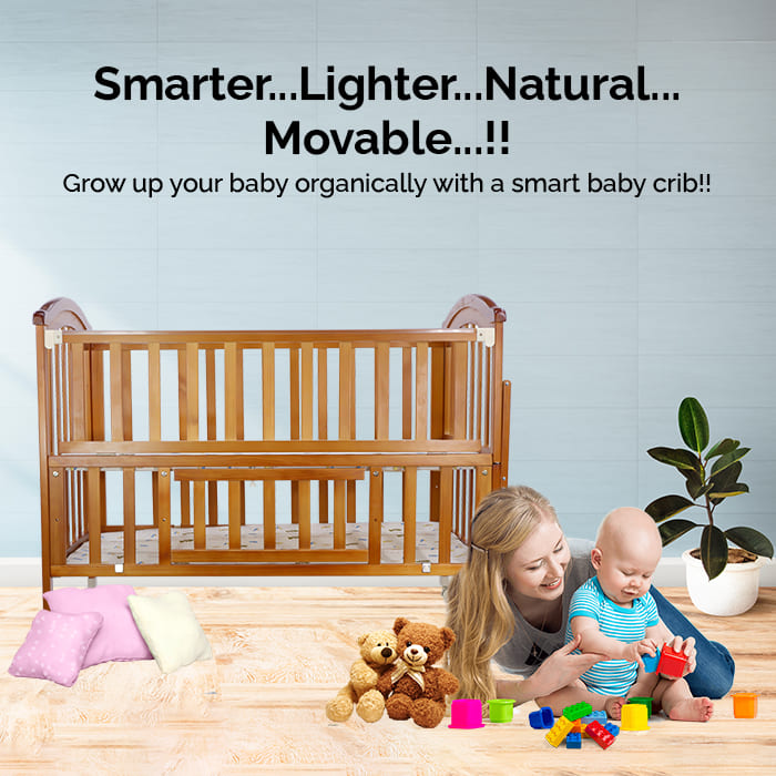 Dreams got wheels : The 65.5 cm crib has taken care of the size of bedroom door opening which is generally 80-90 cm. The crib has wheels and a foot brake for a smooth like butter movement around the house. And that too without disturbing the baby’s sleep.