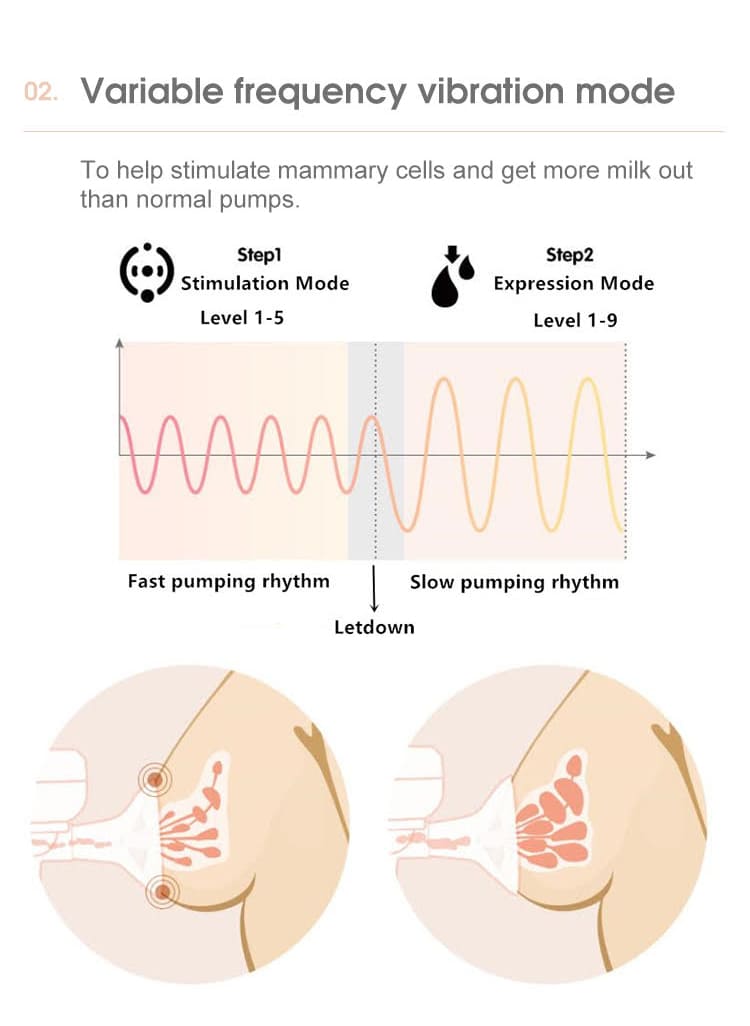 Variable frequency vibration mode: To help stimulate mammary cells and get more milk out than normal pumps.