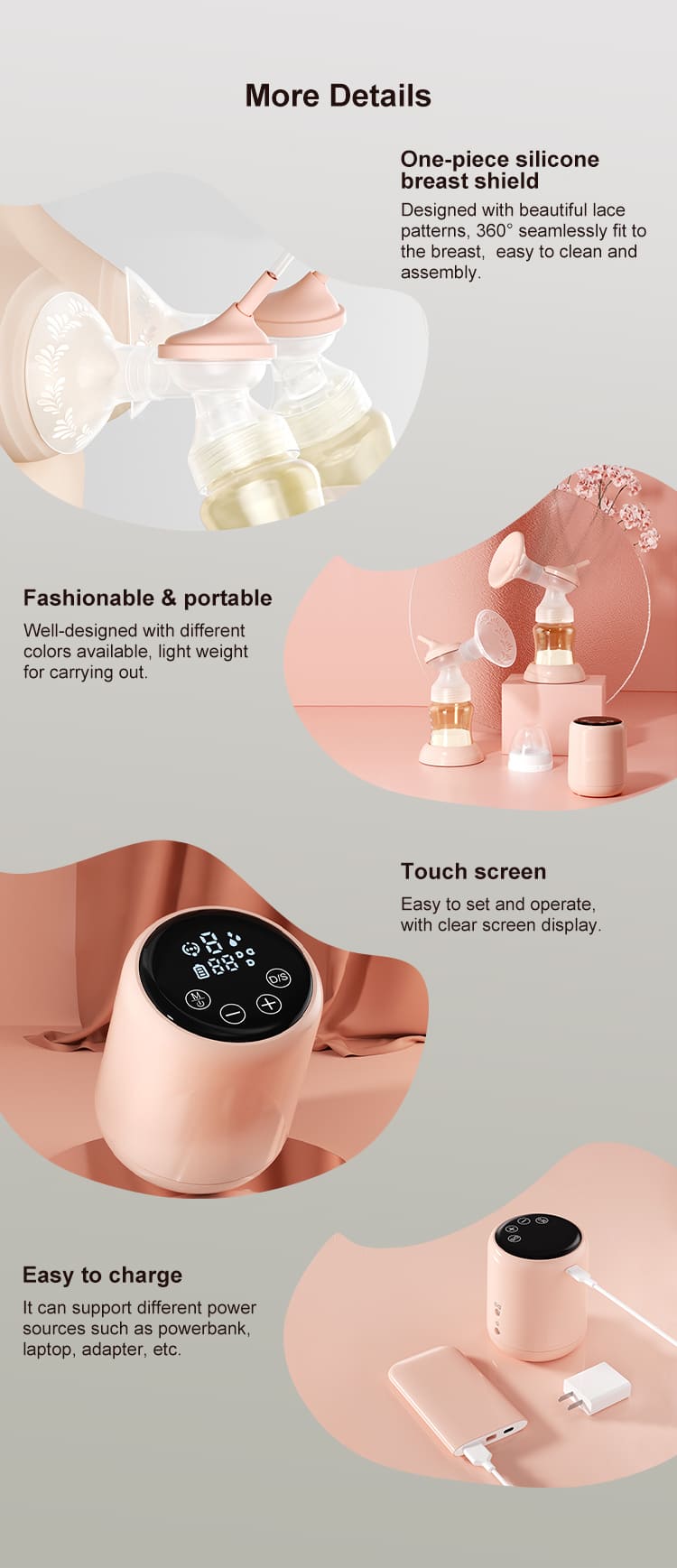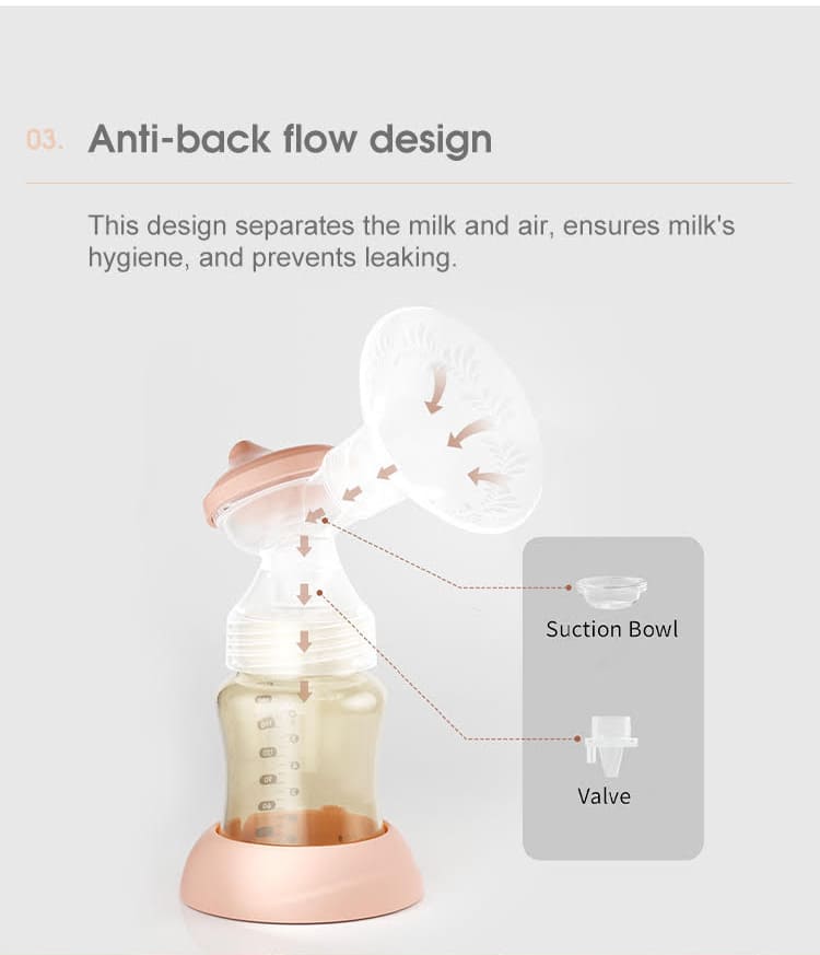 Anti-back flow design: This design separates the milk and air, ensures the milk’s hygiene, and prevents leaking.