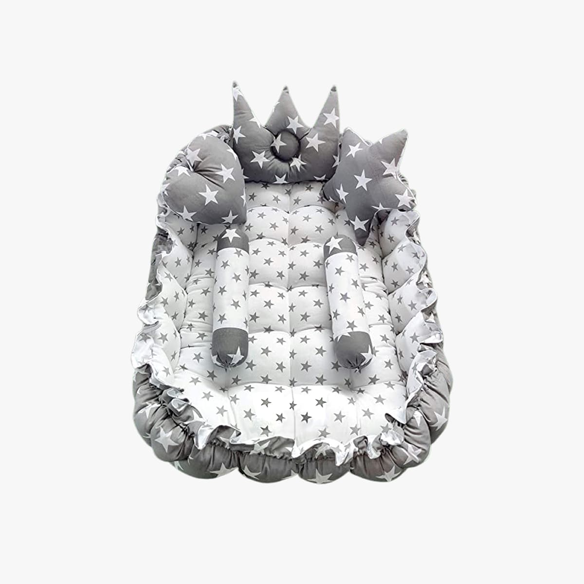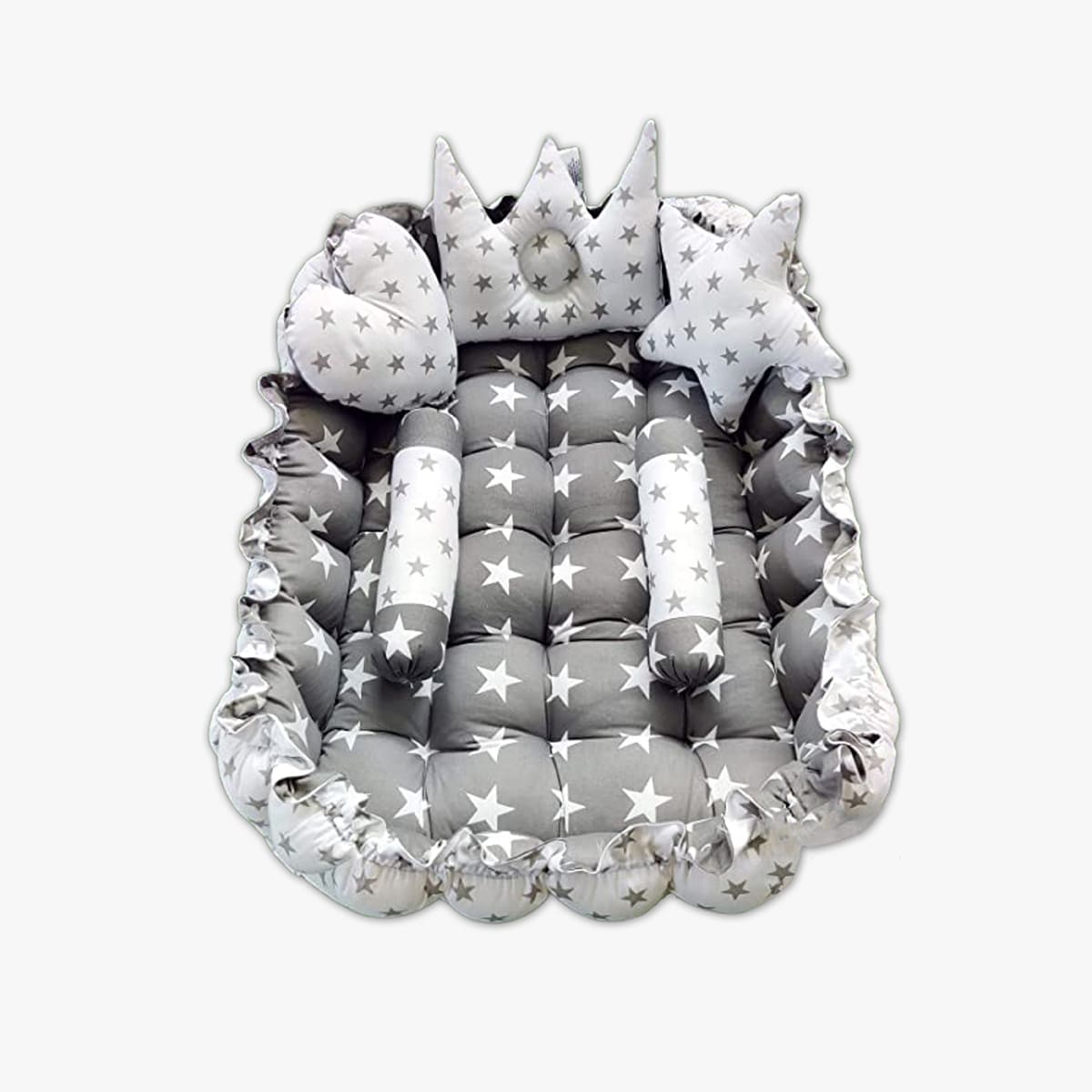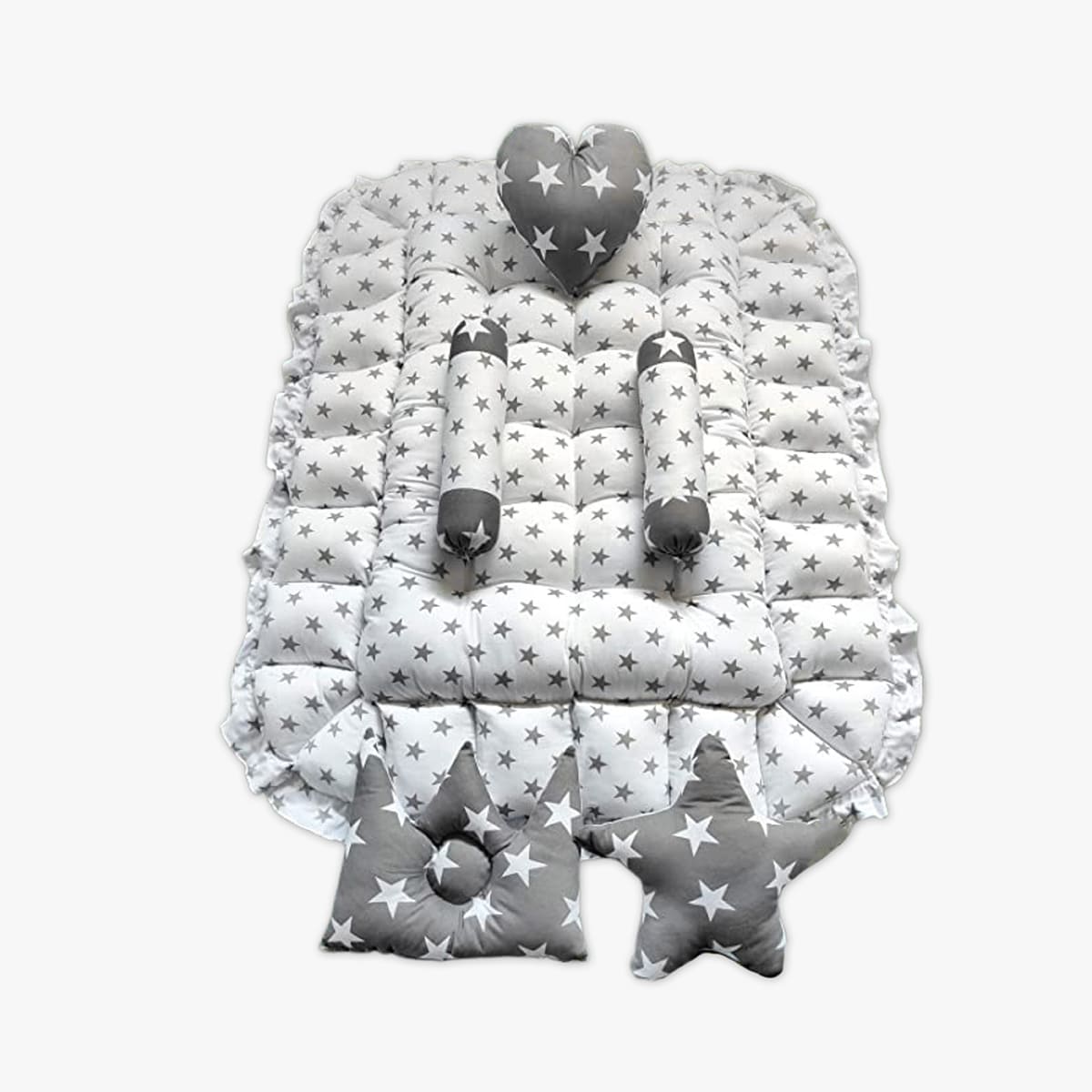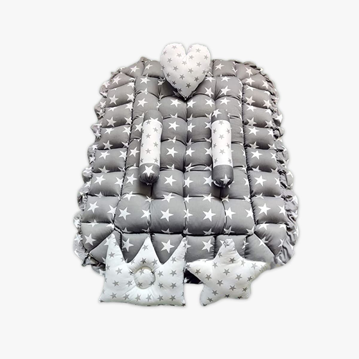 StarAndDaisy Rectangle Baby Tub Bed With 5 Baby Pillow Luxury Baby Mattress Bed Sleeper Bedding Set Co-Sleeper, Rich Cotton Fabric with R-Filled Ultra-Soft Comfortable for Newborn to Toddlers (Grey & White)