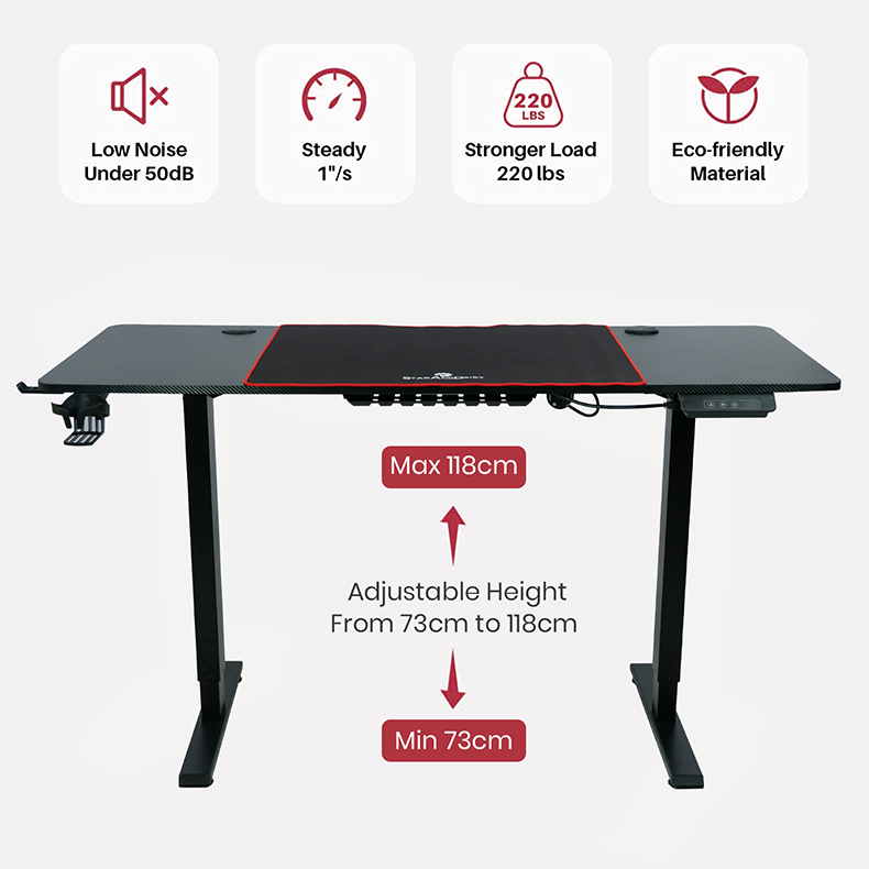 DUAL MOTOR ELECTRIC LIFTING SYSTEM: The powerful dual motor system running at a lift speed of 1”(Max) per second offers a smooth and stable desk height adjustment, from 27.7” to 46.9” (70.5cm-119cm). It is designed to hold up to 220LB with no wobble and make low noise (under 50 db) during height transition. The special valuable function is that the desk can automatically adjust reversely when it hits something during going down or going up, effectively protecting the tabletop from damage.