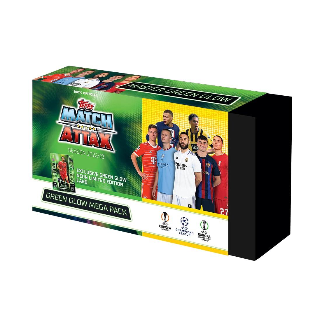 Get the Match Attax 22-23 Green Glow Mega Pack! With the special edition Green Glow neon Leon Goretzka card and a collection of stunning Topps Cards, including 52 base cards, 15 Mirror foil cards, 10 Holo foil cards, 8 15th anniversary cards, 5 Gold Le cards, 3 100 club cards, 2 Black edge cards, and new autographs & relic cards, this limited edition pack is a must-have for Match Attax enthusiasts. Experience the joy of collecting and trading cards whether you’re a seasoned collector or just starting out. Surprise yourself or someone else with this exciting pack and elevate your Match Attax journey.