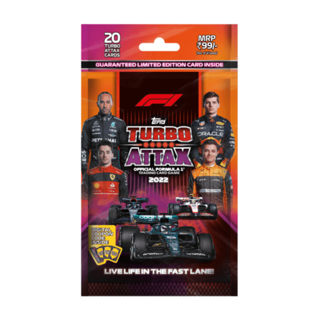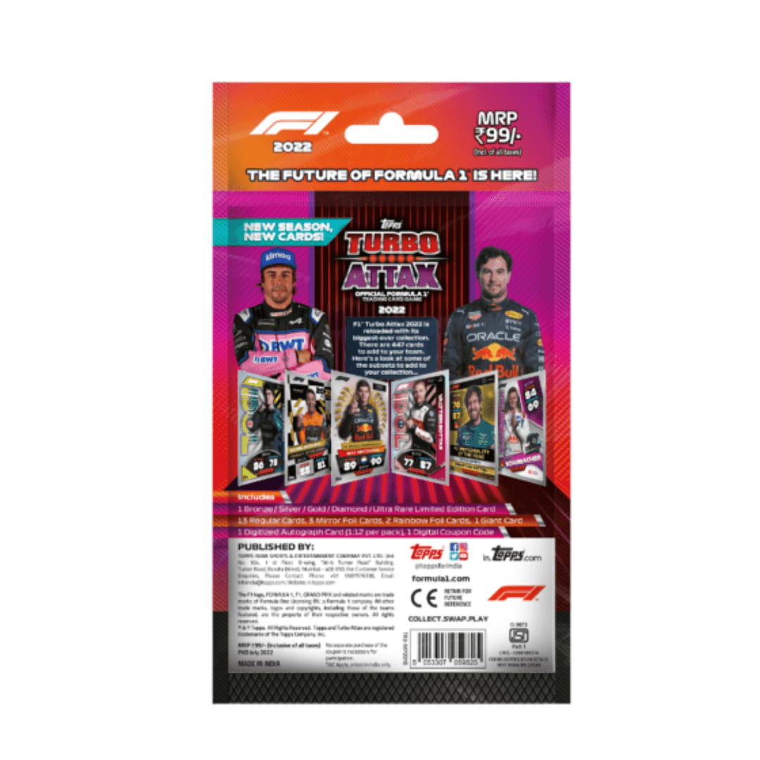 Experience the thrill of Formula 1 with the Topps Turbo Attax Official Formula 1 2022. This multipack is packed with the biggest ever collection of F1 cards. Inside each multipack you’ll find 1 Bronze / Silver / Gold / Diamond / Ultra Rare Limited Edition Card, 13 Regular Cards, 3 Mirror Foil Cards, 2 Rainbow Foil Cards, 1 Giant Card, 1 Digitized Autograph Card (1:12 per pack), and 1 Digital Coupon Code.