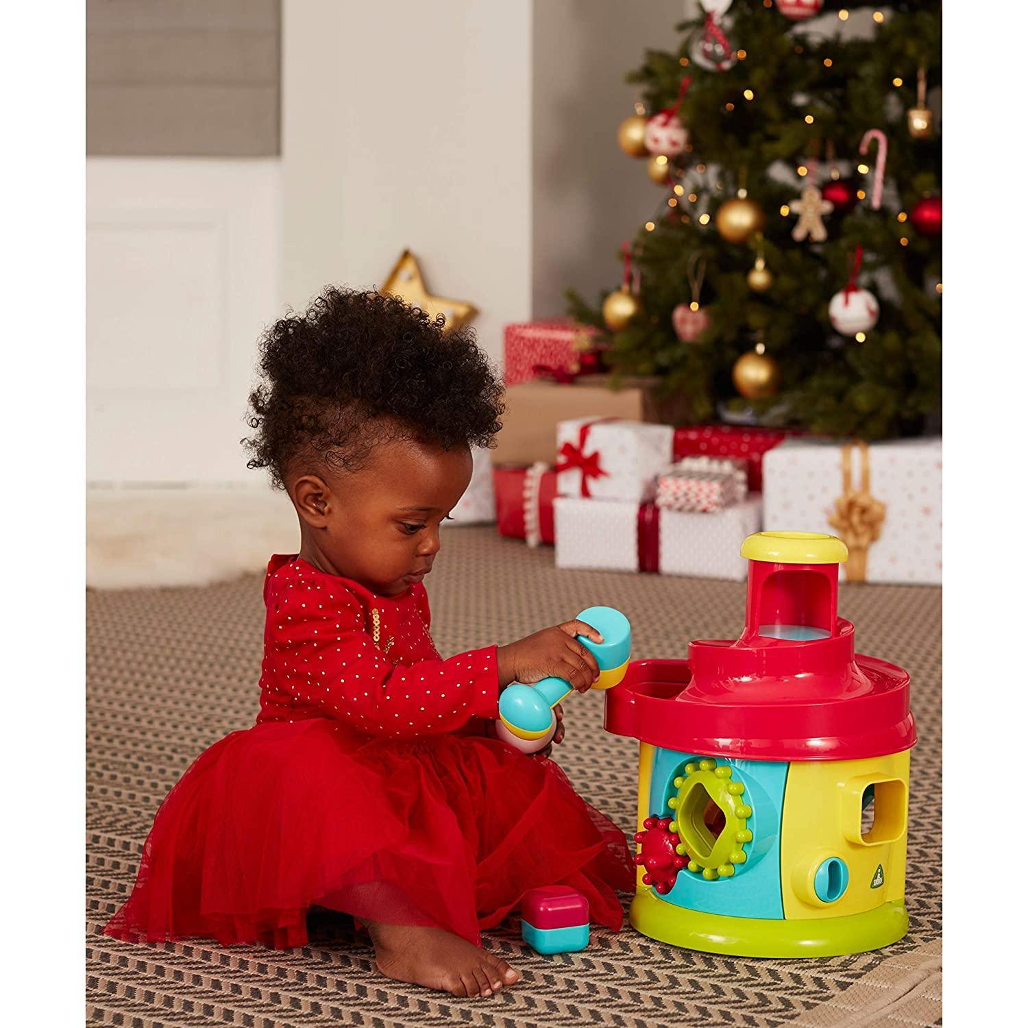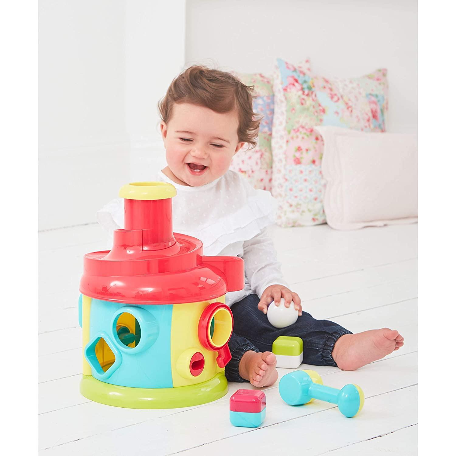 As your baby gets older, they can discover which shapes fit into the holes and tap them in using the hammer. They can post balls into the chimney and down the ball run, or discover how to open the doors using the keys.