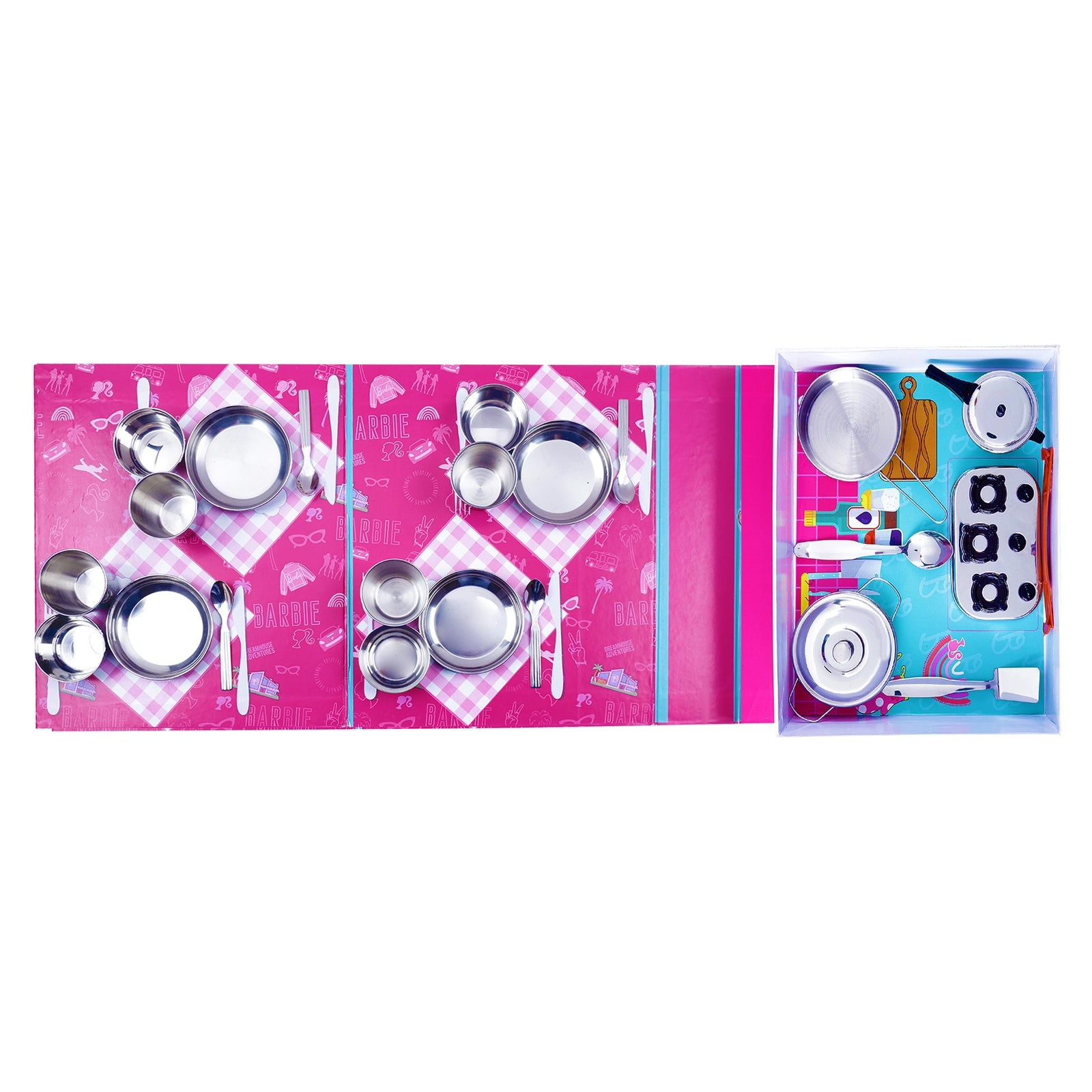 Mini Plate 8.5 x 8.5 x 1.5, Mini Bowl 5.5 x 5.5 x 2, Mini Spoon 9 x 2, Mini Tumbler 5 x 5 x 4, Serving Spoon 14.5 x 3, Frying Pan 16.2 x 9.3, 1 Mini Gas Stove 12.5 x 8 x 2.5, Casserole 14 x 3.5