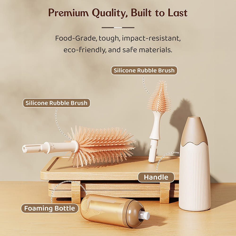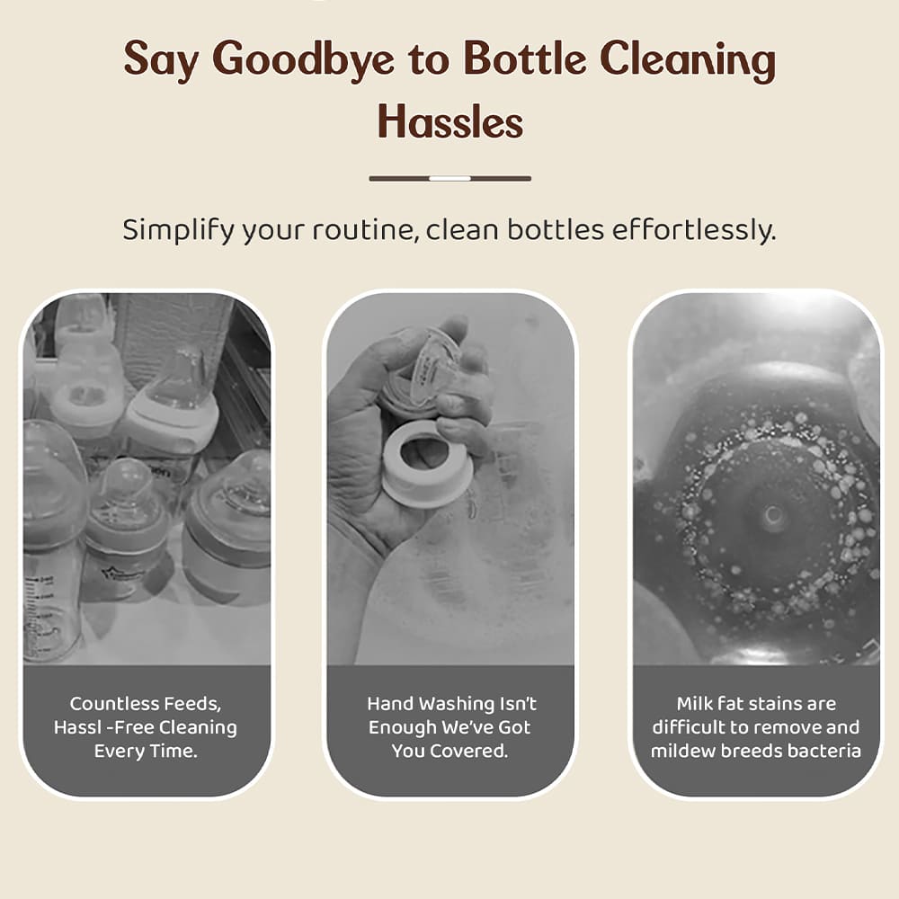 - 500ml Liquid Cleanser The included bottle of liquid cleanser is formulated with baby-safe ingredients that effectively eliminate milk residue, grease, and odors, ensuring your baby’s feeding items are clean and hygienic.