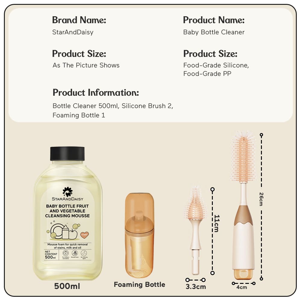 - Complete Cleaning Solution for All Baby Needs: This set provides a comprehensive cleaning solution that features a 360° brush, a sturdy handle, and a 500ml liquid cleanser, ensuring that every baby accessory is thoroughly cleaned and ready for use.