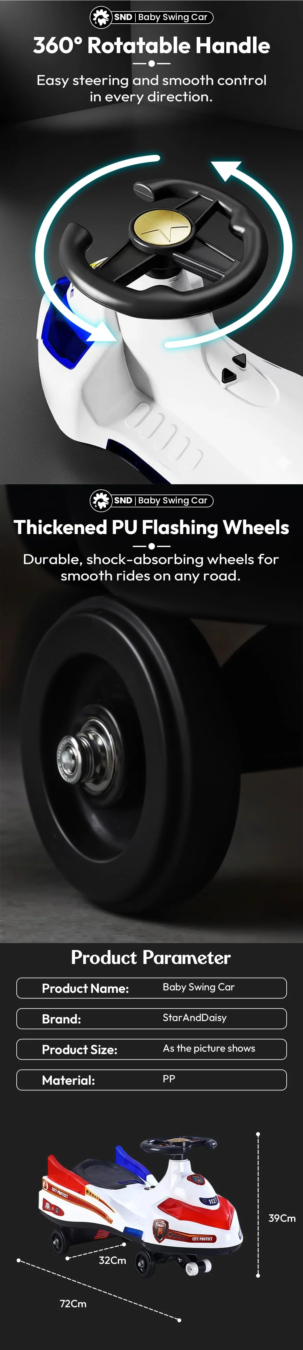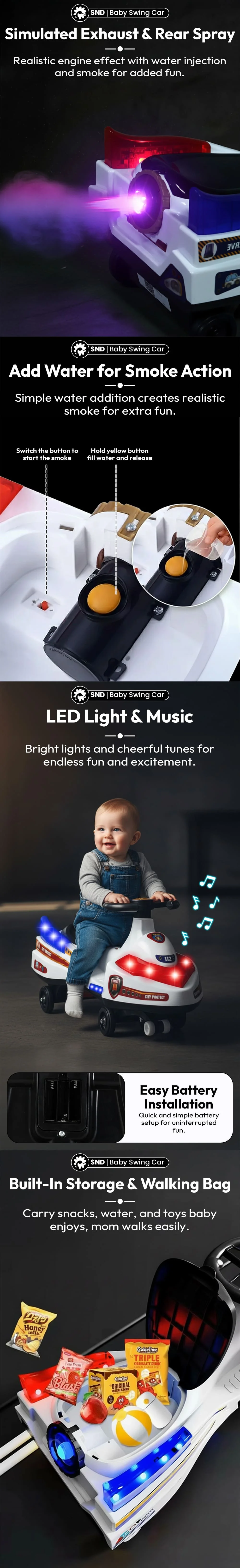 StarAndDaisy Baby Swing Car with LED Lights, Music, Smoke Effect & Storage, Ride-On Toy for Kids – White