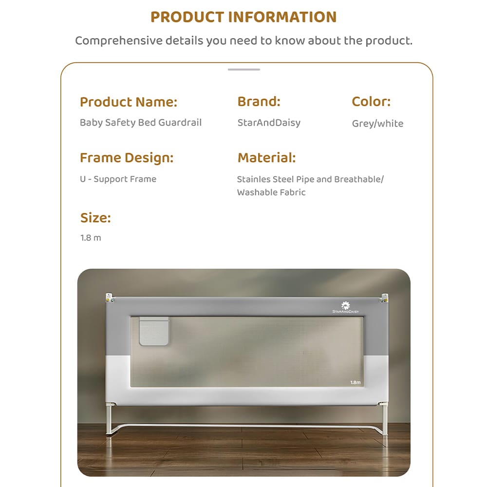 StarAndDaisy Bed Rail Guards for Babies Safety, Baby Bed Fence with Universal fit for king Size Bed – U-Full Body Support Frame 1.8m (Grey White)