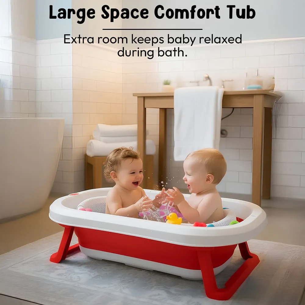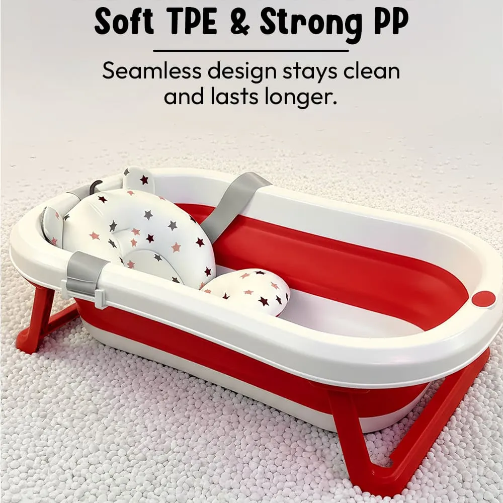 StarAndDaisy Bt Luxe Baby Bath Tub, Foldable Infant Bathtub with Floating Cushion and Anti-Slip Support – Red & White