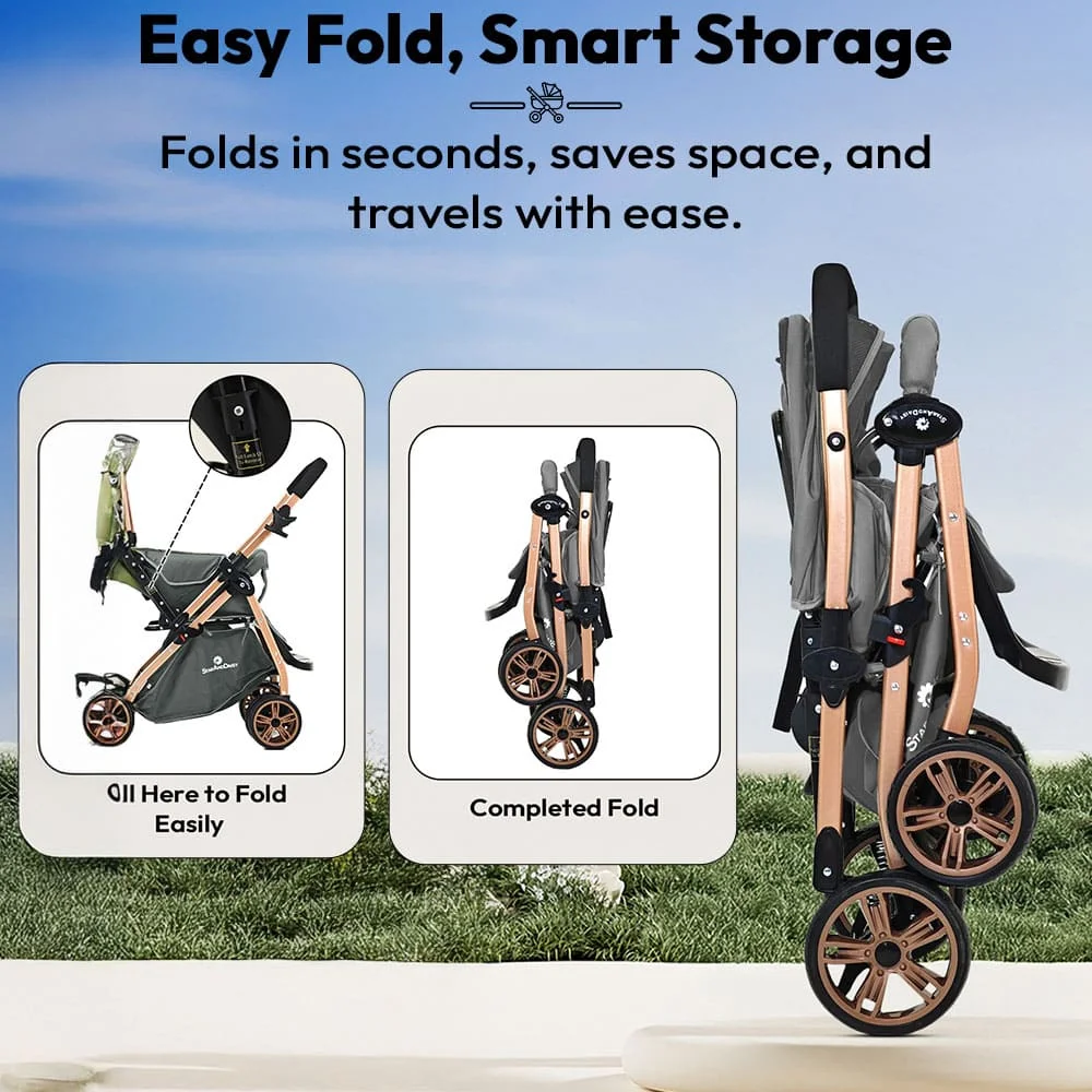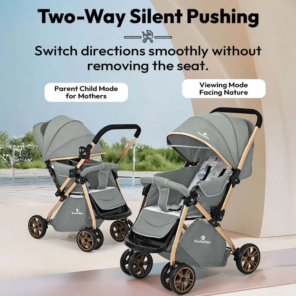 StarAndDaisy Daisy Trot Baby Stroller, Lightweight, Foldable, Multi-Position Recline with Safety Belt & Shock Absorption – Grey