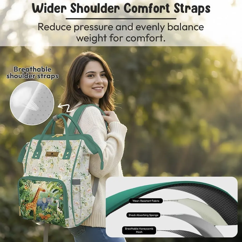 Floral Diaper Bag Backpack with Jungle Animal Front Pocket – Spacious, Water-Resistant, Stylish & Functional for Travel and Daily Use – White & Green