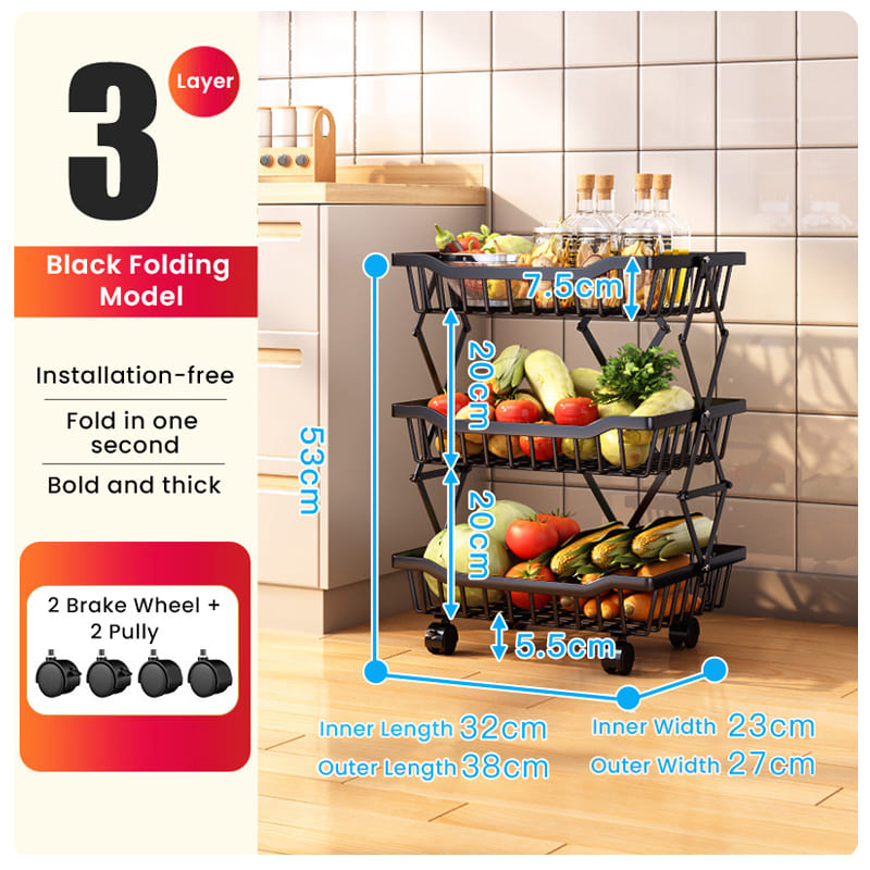 Introducing our multifunctional 3-tier basket cart, perfect for storage and display. Use it as a Vegetable & Fruit Organizer Rack, potato and onion storage bin, spice, and snack organizer. You can even use it as a veggie holder or a kids’ bathtub toy bin. Its foldable design is convenient and helps save space, making it ideal for your kitchen, bathroom, bedroom, living room, pantry, or wherever you need extra storage space. This convenient Vegetable & Fruit Organizer Rack comes with 4 castors, allowing you to move it easily anywhere in your home. Two of the castors can be locked to ensure safety. We’ve included mini spanners to help you install these 4 rolling wheels.