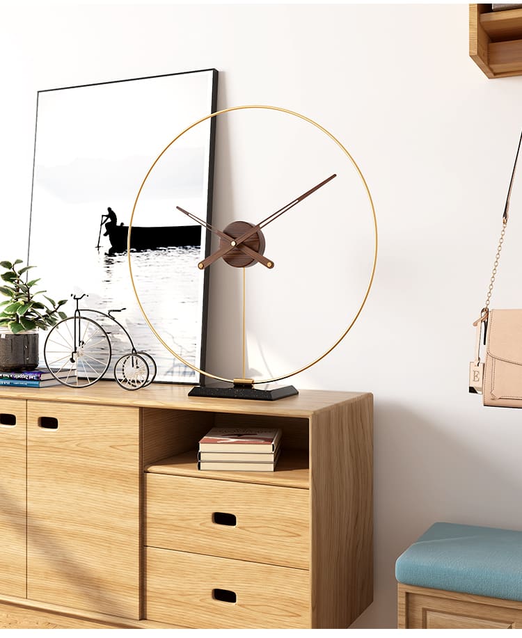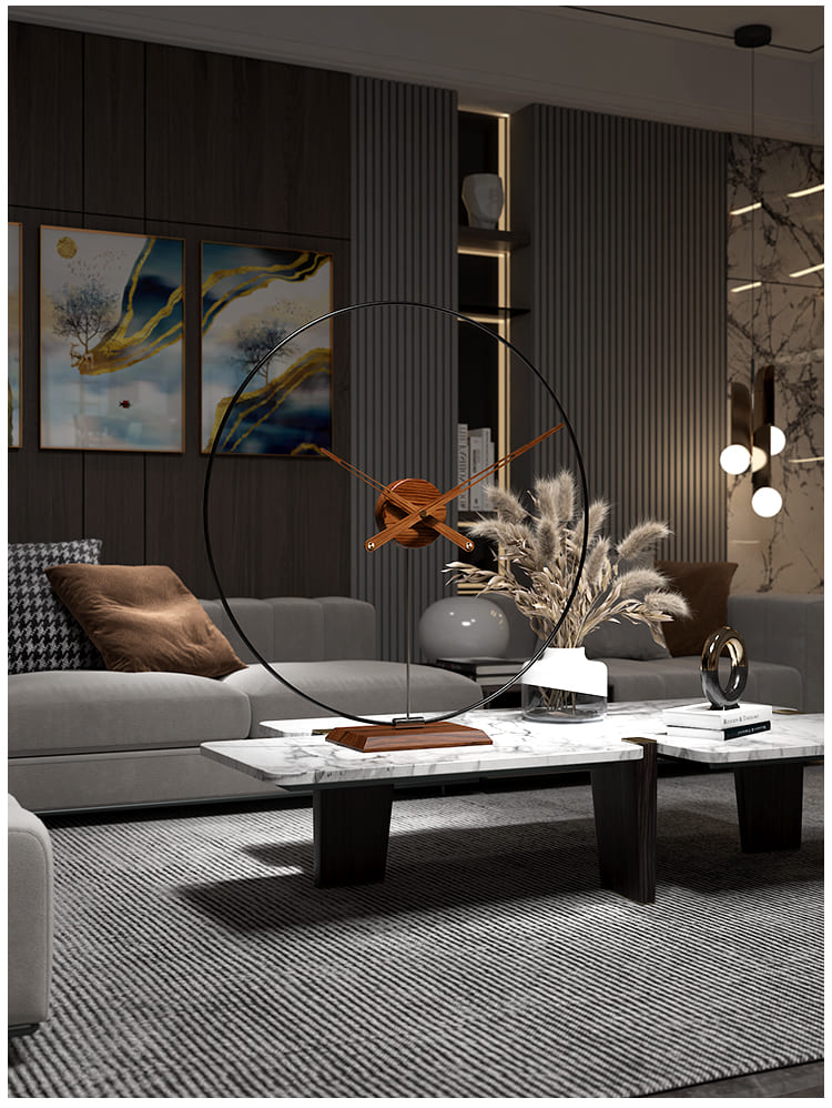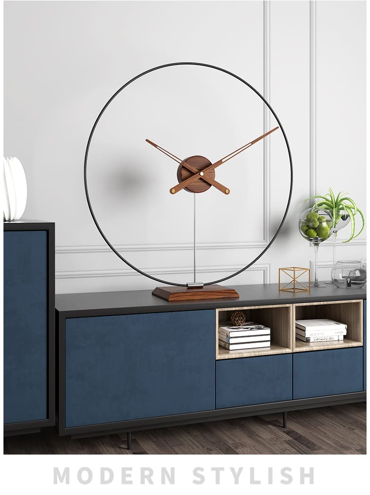 Introducing a contemporary table clock featuring a clear minimalist design, measuring 60 cm in diameter, and powered by a precise quartz movement. This sleek timepiece is an ideal addition to spaces like living rooms or offices, adding a touch of modern tact.
