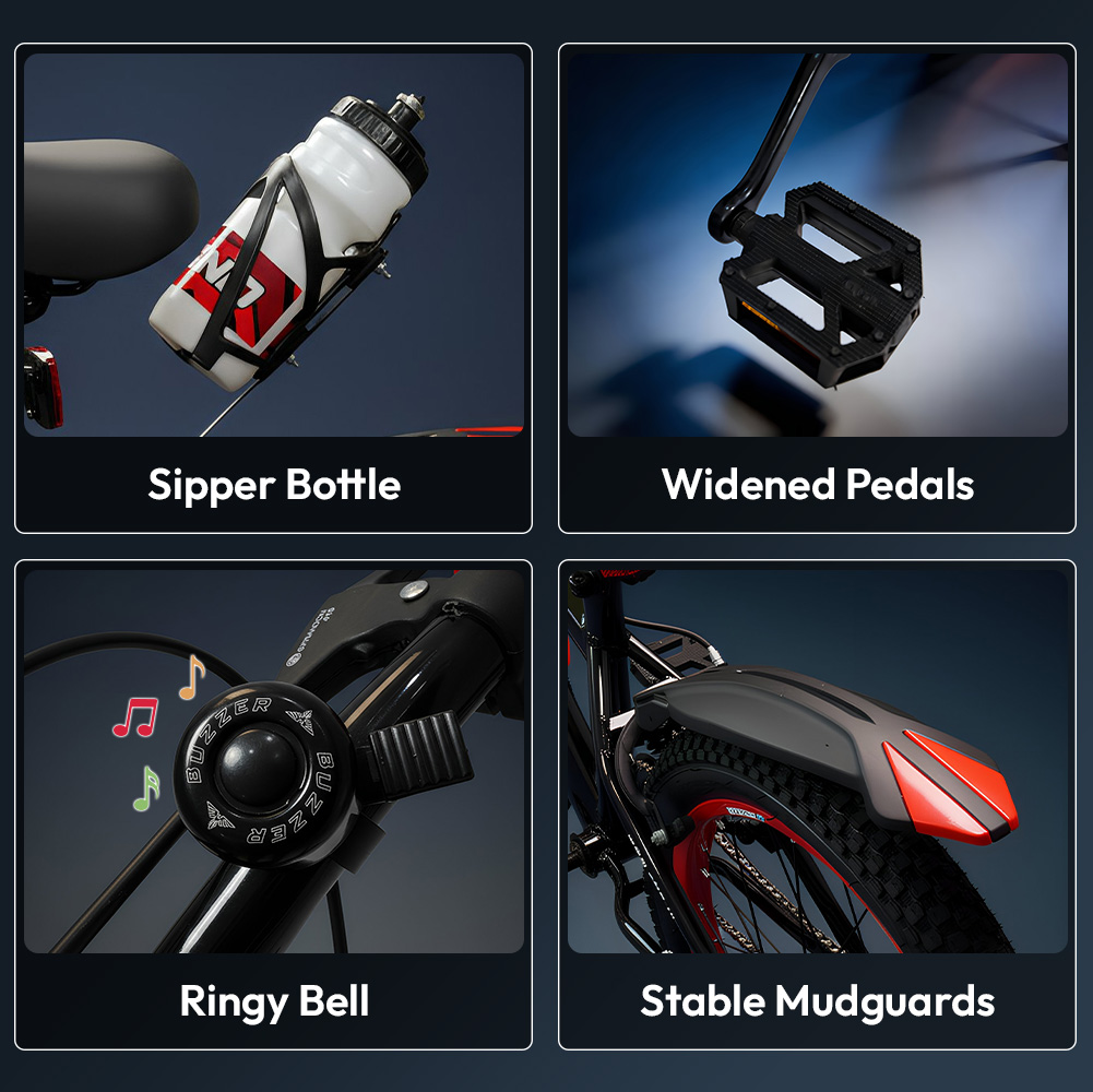 Designed with growing children in mind, this bicycle features an adjustable seat height for long-term use and a smooth, quiet chain system for effortless pedaling. Comfortable anti-slip handle grips, widened pedals, and a cushioned seat enhance comfort and control during rides. Additional kid-friendly accessories like a water bottle, bell, and stable mudguards make every cycling adventure more enjoyable and practical.